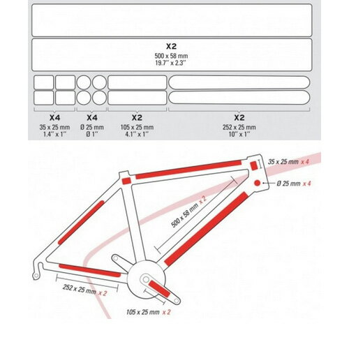 フレームプロテクターシールセットUVや温度差(-30℃ to +100℃)による劣化に強く、気泡が入りにくい。全14枚入りダウンチューブ用:500mm×58mm 1枚トップチューブ用:500mm×58mm 1枚チェーンステイ用:252mm×25mm 2枚クランク用:105mm×25mm 2枚ケーブル用(長方形):35mm×25mm 4枚ケーブル用(丸型):25mm径 4枚厚み:250ミクロン素材:ポリウレタン製商品のカラー・サイズについて商品のカラーはディスプレイの種類等により、実物と異なって見える場合がございます。掲載商品の仕様、ロゴ等のデザインは改良のため、変更される場合がございます。また、メーカーが発表していない寸法や個人的なフィット感についてはお答えいたしかねます。あらかじめご了承ください。沖縄県への送料について 沖縄県への発送に送料無料は適用されません。購入金額に関わらず1,650円(税込)が通常送料に別途加算されます。