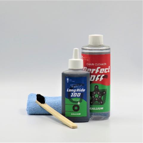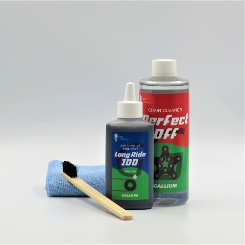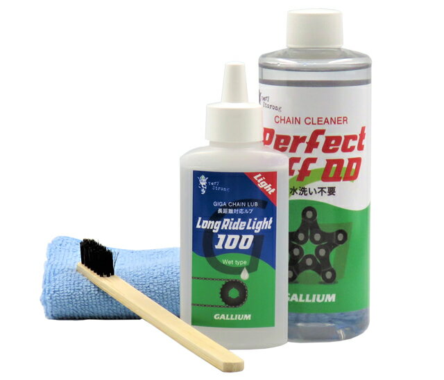 GALLIUM (ガリウム) Perfect off クリーニングセット ● セット内容:GIGA Chain Lube Long Ride 100×1、Perfect off 300×1、ブラシ×1、タオル×1 GIGA Chain Lube Long Ride 100 100ml ロードレースや、あらゆるシチュエーションで使用できる万能ルブ。 液体の低摩擦性に加え、摩擦が増える原因となる汚れを防ぐ効果があります。メンテナンス直後の「軽さ」が400km以上持続し、軽快なサイクリングを可能にします。 ● あらゆるシチュエーションで使用できる万能ルブ ● 金属の摩耗を防ぐモリブデン配合 ● 素材:パラフィン、モリブデン ● ルブカラー:ブラック ● 容量:100ml Perfect off 300 300ml 遅乾性 潤滑成分やサビ止め成分をあえて配合せず、汚れや古くなったルブを除去することに特化したディグリーザー。 ● 水洗い仕上げ用 ● チェーンやプーリー等にPerfect offを塗布し、汚れのひどい部分はブラシで擦ってください。その後、中性洗剤と水で洗い流し、良く乾かしてからルブを注してください。 ● 内容量:300ml ご注文の前にご確認ください表示されている在庫情報については、実際の在庫情報と連動しておりません。ご注文頂きましたら、弊社および仕入先の在庫を確認いたしまして、メールにてご連絡させて頂きます。廃盤や欠品・納期未定などの理由により、ご注文をキャンセルさせていただく場合がございます。商品のカラーはディスプレイ環境により実物と異なって見える場合がございます。掲載商品の仕様、ロゴ等のデザインはランニングチェンジ等により予告なく変更になる場合があります。ご利用ガイドの内容をご覧いただき、ご了承頂いた上で ご注文をお願い致します。