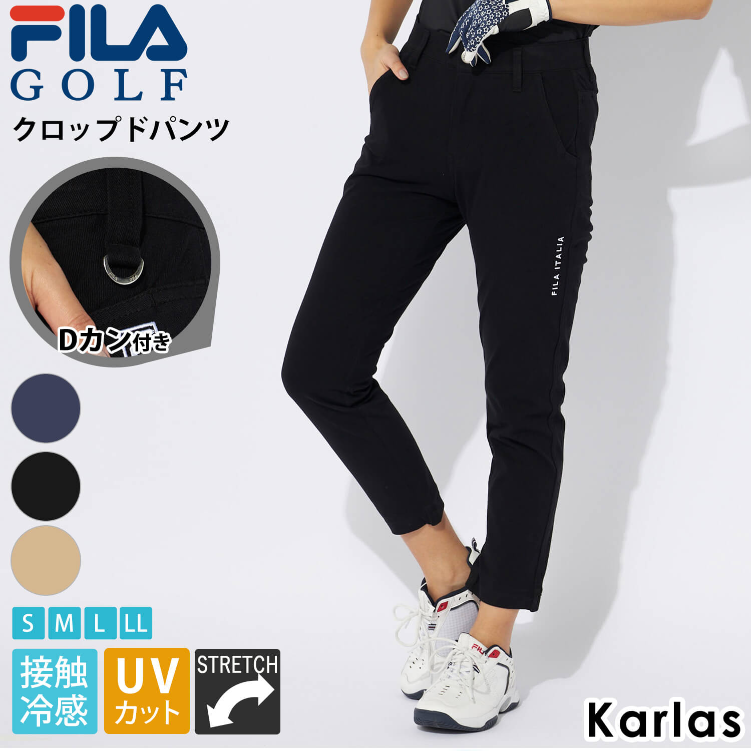 【在庫処分!】 FILA GOLF フィラゴルフ ゴルフウェア ロングパンツ レディース クロップドパンツ 春 夏 接触冷感 ひんやり UVカット ストレッチ Dカン付き スポーツブランド ボトムス おしゃれ きれいめ 細見え 脚長効果 S M L LL 黒