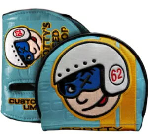 スコッティキャメロン カスタムショップ ジョニーレーサー スコッティブルー ミッドマレット 2022年11月から販売開始されたリミテッドヘッドカバー。ゴーのホットスタンプがされたスコッティブルーのレザー調の生地に、カスタムショップマスコットのジョニーレーサーが大きく刺繍されています。サイドにもジョニーレーサー、反対サイドにスコッティズスピードショップの刺繍、限定生産