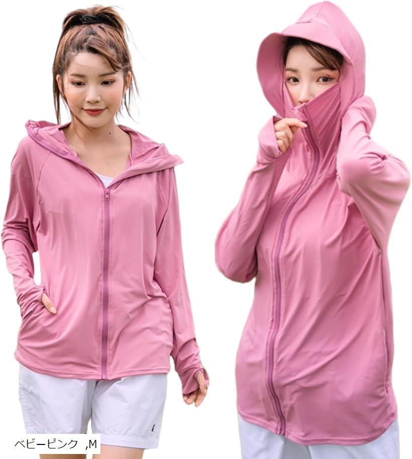 ラッシュガード レディース 水着 UVカット パーカー 長袖 つば付き 顔まで 速乾 冷感 通気性 体型カバー(ベビーピンク, M)