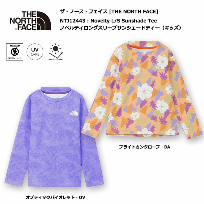 【ブランド】THE NORTH FACE/ザ ノースフェイス 【アイテム】ノベルティロングスリーブサンシェードティー(キッズ) 【製品番号】NTJ12443 【カラー】ブライトカンタロープ・BA , オプティックバイオレット・OV 【Fabric】 Recycled Polyester(ポリエステル100%) 【Function】耐塩素/ロゴプリント夏の強い日差しから子どもの肌を守る、水陸両用の長袖Tシャツ。ヨセミテ国立公園・ミラーレイク周辺の植物をモチーフの柄と、ブランドロゴを地紋にした2色のノベルティカラーです。 リサイクルポリエステルを使用した鹿の子編み調の生地は、水に濡れても素早く乾くうえ、濡れているときでも肌への張りつきを抑えてドライな着心地です。首周りの日焼けがしにくいよう、後ろ襟をやや高めにデザインしています。UVプロテクト(UPF50+、紫外線カット率95%以上)機能付き。耐塩素仕様で、プールでの着用にも適しています。 水辺のアクティビティやキャンプなどのアウトドアシーンのみならず、普段使いもしやすい1着です。 【機能性】UVカット 【STATIC CARE】静電防止部材を採用して、静電気の発生を抑えた静電ケアに配慮している。 【UV PROTECT】強い日差しに対応。UPF(紫外線保護指数)50+、UVカット率95%以上を確保。 【GREEN MATERIAL】リサイクル原料や植物由来原料など環境への負荷を抑えた素材。