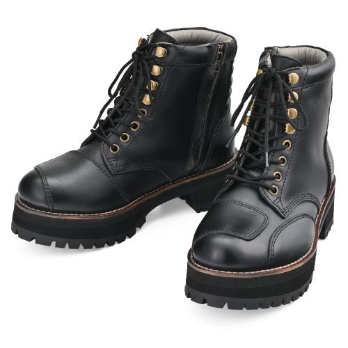 MaxFritzの佐藤氏が監修。4ホール、4フックのレースアップショートブーツ / 厚底タイプ 厚底33mmで足つきを改善。部分ごとにソールの厚さを変えることで、シフト操作性が高く運転しやすい 2mm以上の厚みのあるフルグレインレザーを厳選して使用。一般的なオイルレザーよりもさらに多くのオイルを染み込ませて作られたレザー E相当のワイズで細身のシルエット。細身のシルエットに厚めのソールがレザーブーツらしい重厚感を演出。取り外し式インナーソールでサイズ調整可能 シフトパッド / くるぶしパッド / すべり止め加工したソール / 履き口にクッション / YKKのサイドジップ