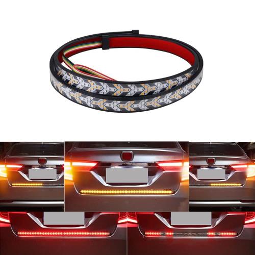 シーケンシャルLEDテープ12V車専用のシーケンシャルLEDテープが登場。ウインカーとハザードランプを使用する時はアンバー、ブレーキランプとデイライトを使用する時はレッド、テープライトは対応のモードに自動的に切替、LEDの光をスムーズに流れます。運転中大部分の状況に対応できるテープライトです。愛車をより個性的に、より目立つに!おしゃれな雰囲気も醸し出すことができます。 視認性抜群ドレスアップだけではなく、安全性・認識性を格段にアップするLEDテープライトです。ランプの内部に高品質のLEDチップを搭載、全体が均一に発光し、かなりの明るさを実現できます。明るくて鮮やかな発光、より快適、よリ安全な走行をサポートします。悪天候時にも高い視認性を実現、後部不慮の事故などを防ぎます。 柔らかさと防水性柔軟性を持つため、車のラジアンによくフィットし、隙間なく着装できます。シリコンのテープなので、防水加工済み、浸水への心配もなくなります。悪天候にも使えます。相変わらず明るくて鮮やかな発光できます。 取付簡単LEDテープライトの裏面には強力な両面テープがあります。穴上げなど複雑な加工は不要、貼り付けで着装完成。配線説明白線:ACC/プラス(+)、赤線:ブレーキのプラス(+)、黄色線:左ウインカーのプラス(+)、緑線:右ウインカーのプラス(+)、黒線:マイナス(-)。 商品仕樣商品名:2色 流れるLEDテープライト / 発光色:レッド+アンバー / 長さ:120CM / 適用車種:12V車専用 / 機能:ウインカー、ブレーキランプ、ディライト、ハザードランプの機能を一体化している。