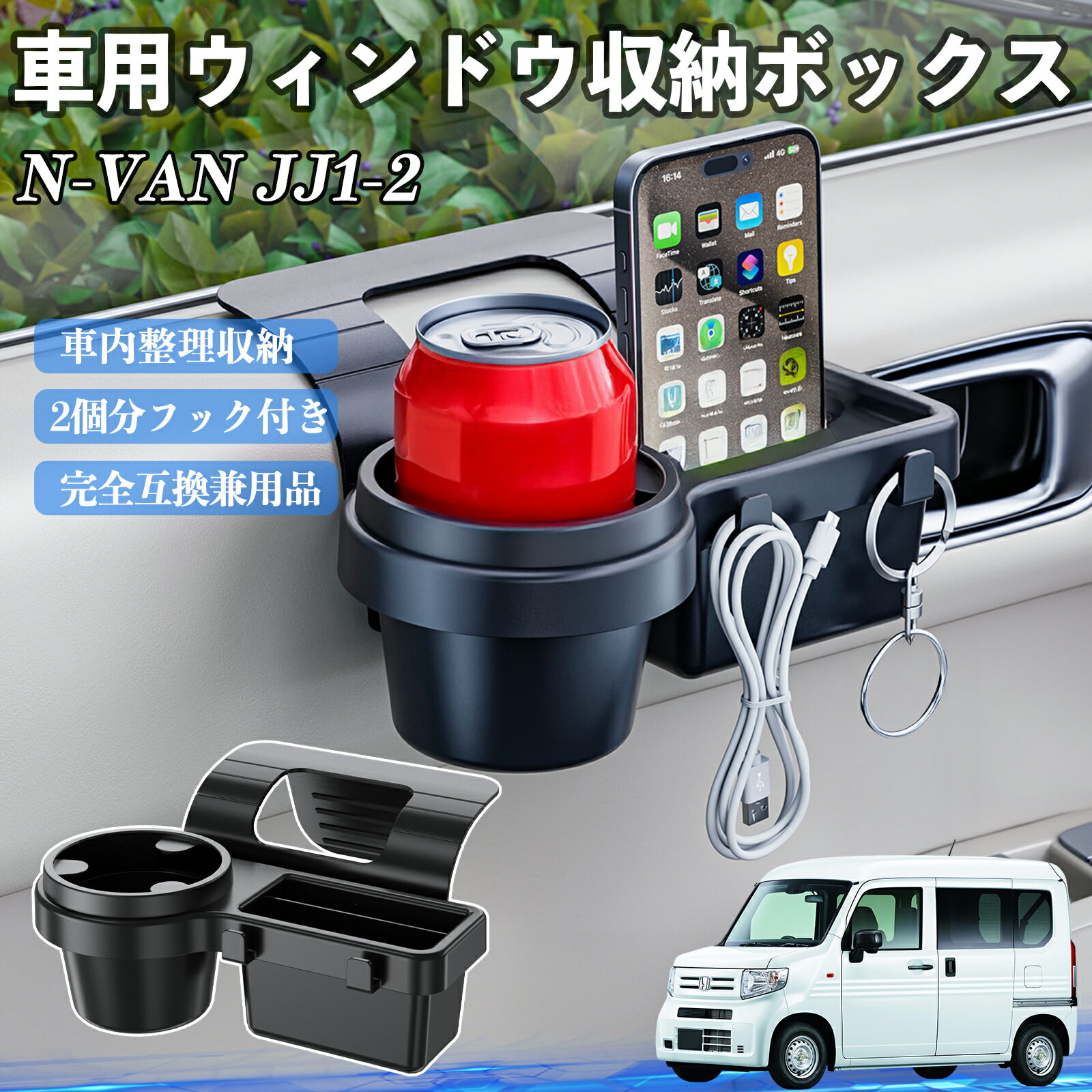 本田 N-VAN JJ1 JJ2 車用ウィンドウ収納ボックス ドリンクホルダー スマホホルダー カップホルダー トレイ フック付き ienobenrikan