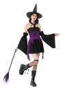 ハロウィン衣装 魔女風 4点セット トップス+スカート+袖カバー+帽子 ホルターネックオフショルダー ノースリーブ 大人用 ショート丈 黒x紫 コスプレ衣装 イベント 学園祭 文化祭 舞台衣装 靴下追加可 仮装 変装パーティー コスチューム 可愛い ステージ衣装 悪魔