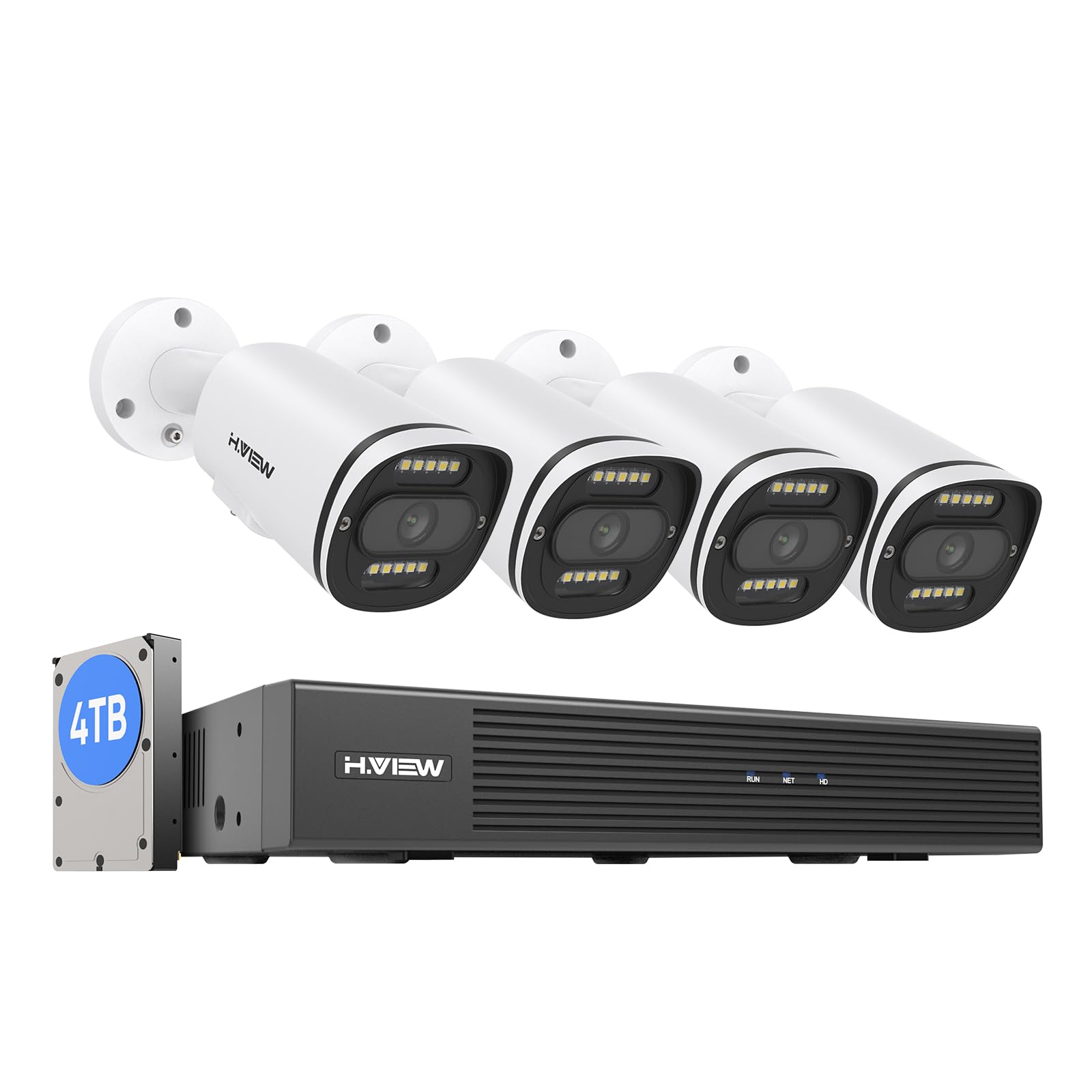 【4K画質・フルカラー撮影・双方向音声】H.View 防犯カメラ 4台セット 4K 800万画素 有線 カラー暗視 POE給電カメラ 8ch H.265 4Kレコーダー 8台まで増設可 音声録画 AI検知機能 IP67防水防塵 WDR技術 24/7フルカラ
