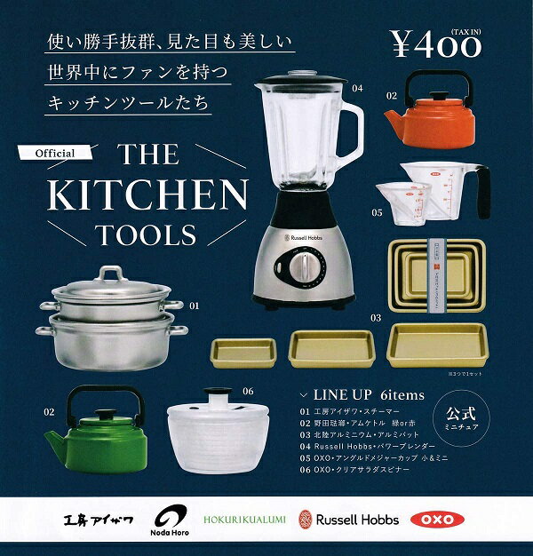 メーカー:ケンエレファント スペック:カプセルを除去し、クリアパックに梱包しております。中のビニール包装は未開封となっており新品です。商品の個数分リーフレットが付属しております。 商品説明: <1>工房アイザワ・スチーマー <2>野田琺瑯・アムケトル(緑or赤) <3>北陸アルミニウム・アルミバット <4>Russell Hobbs・パワーブレンダー <5>OXO・アングルドメジャーカップ 小&ミニ <6>OXO・クリアサラダスピナー <2>は緑か赤のどちらかランダム1点ですのでご注意ください。