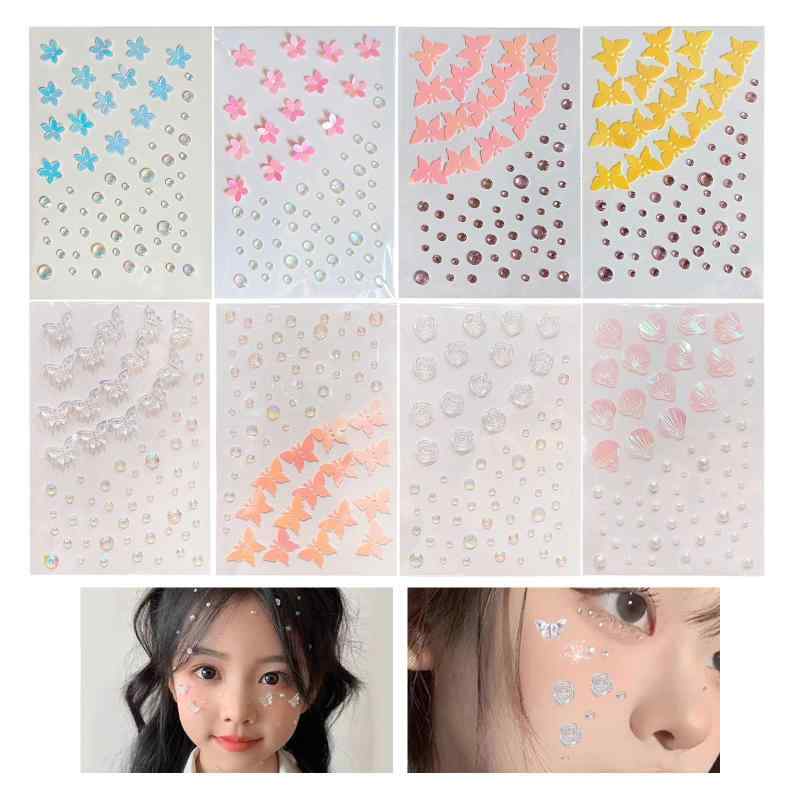 aninako ラインストーン シール 8枚セット フェイスシール 3D キラキラ 顔 シール 蝶 貝殻 薔薇 舞台化粧 DIY ネイルデコパーツ 携帯電話装飾 手芸用品 貼り付け可能 ハロウィン クリスマス 誕生