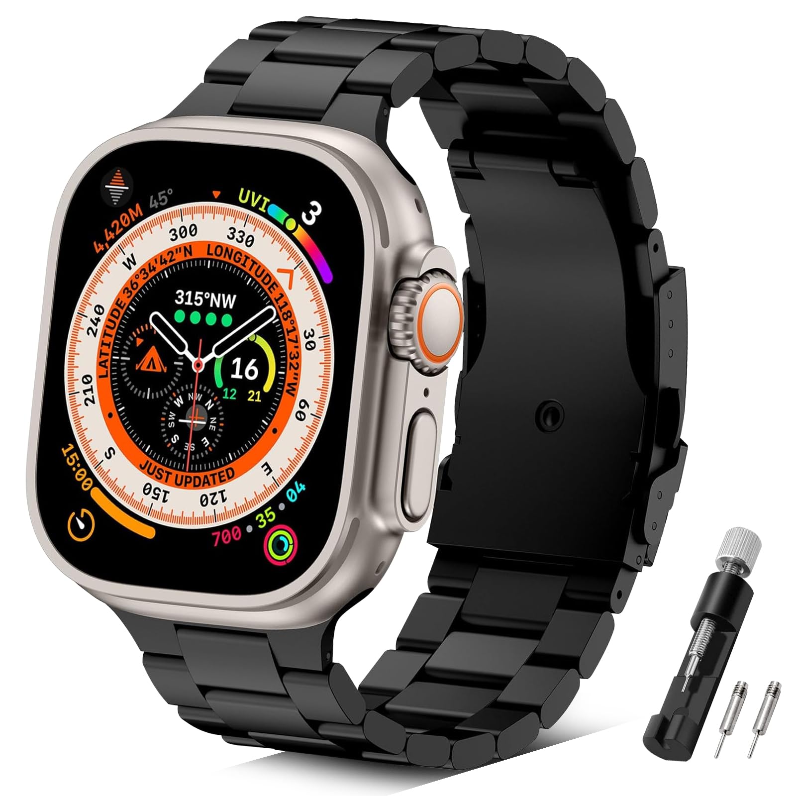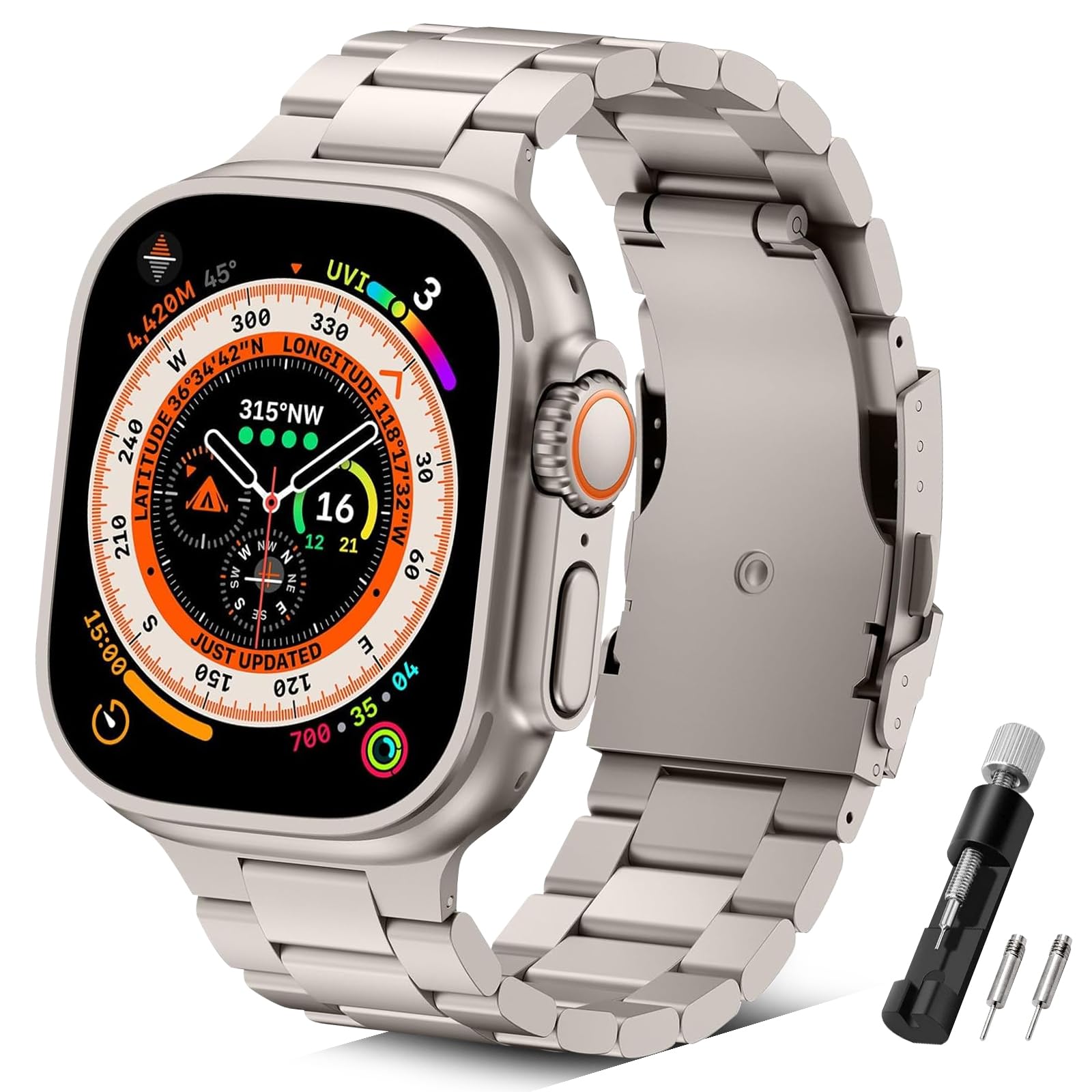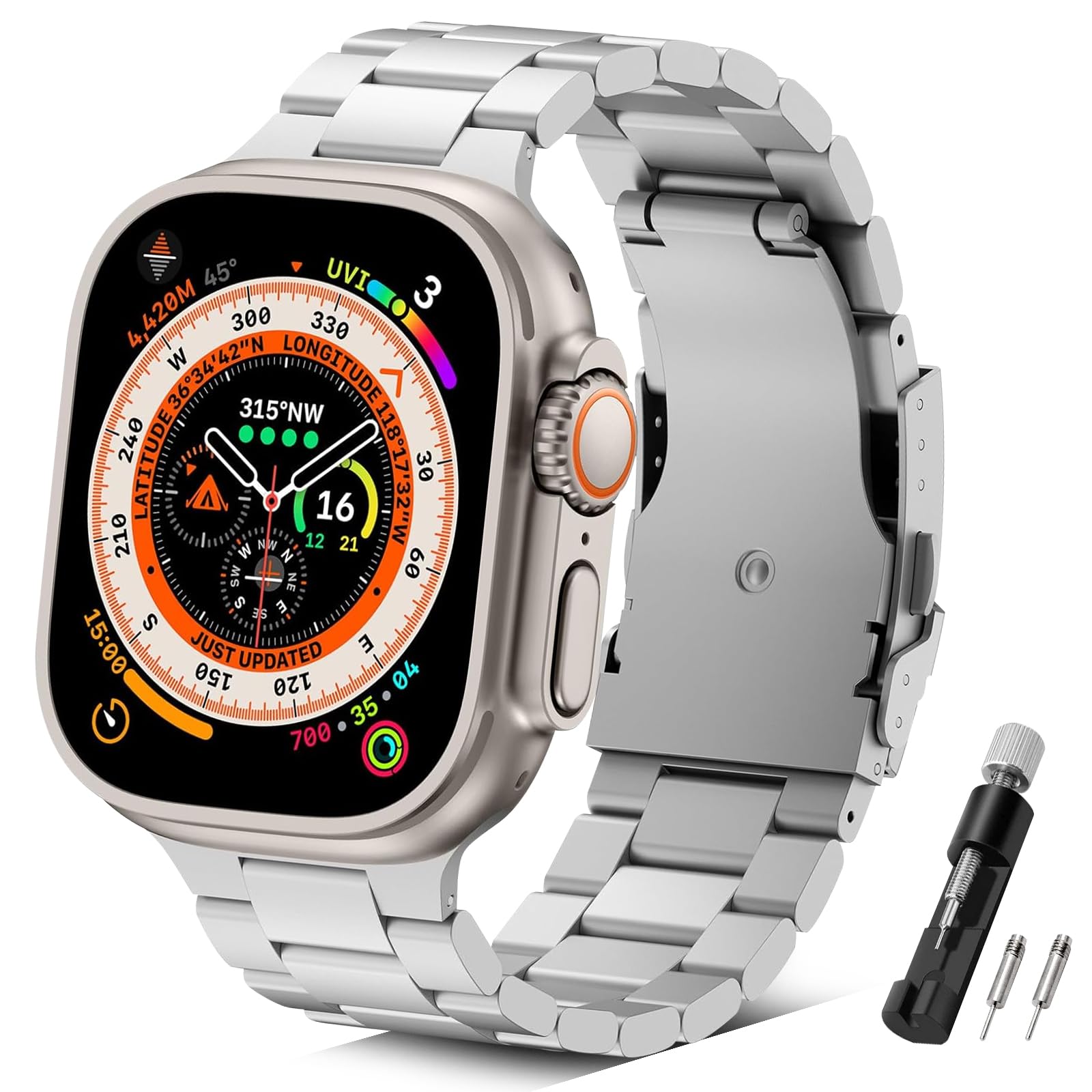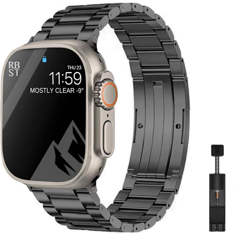 ・【対応機種・サイズ】このApple Watchスポーツバンドは、Apple Watch Ultra 2/Ultra [49mm]、Series 10[46mm]、Series 9/8/7[45mm]、SE2/SE/Series 6/5/4[44mm]、Series 3/2/1 [42mm]に対応。手首サイズは140mm-215mmに適し、付属の調整工具で簡単に長さを調整できます。購入前にお手首周りを測定して、ぴったりのサイズをお選びください。・【高級チタン合金軽量素材】このバンドはプレミアムチタン合金製で、ステンレス鋼よりも軽量かつ快適です。高強度、高剛性を持ち、低アレルギー性で、長時間の使用でも重さを感じにくく、快適に着用できます。耐久性に優れた特性で、長くお使いいただけます。・【ベルトバックルの強化】チタン合金製の折りたたみ式バックルを採用。二重安全バックルと隠しダブルプッシュボタンにより、時計を簡単かつ安全にロックできます。アダプターとバンドの一体型デザインで、外れる心配もありません。・【大人の雰囲気|ビジネス風】磨き上げられた美しいデザインが特徴で、ビジネスシーンや日常生活でも目を引きます。シンプルでシャープなシルエットが大人の雰囲気を醸し出し、Apple Watch Ultraのチタン製ケースとも調和します。優れた防水性と防汗性を備えており、冒険スポーツにも最適です。・【商品保証】当社は厳しい品質検査を行い、90日間の保証期間を設けています。商品の不具合や不良があった場合、商品交換や返品返金が可能です。商品についてのご質問がある場合は、アカウントサービスの注文履歴から販売者にご連絡ください。迅速に問題を解決いたしますので、安心してご使用ください。