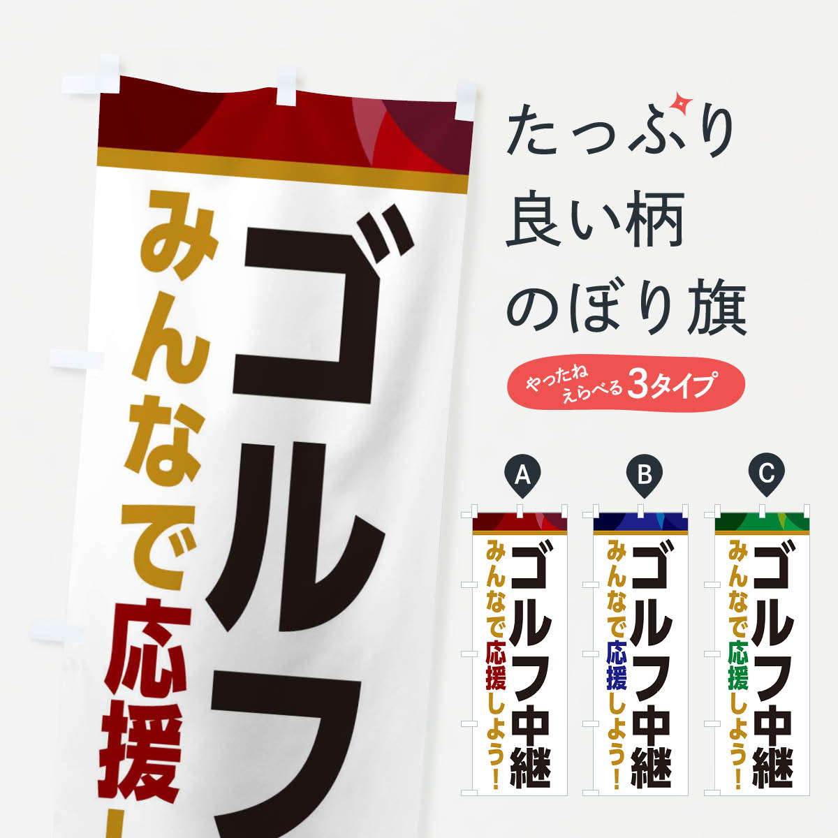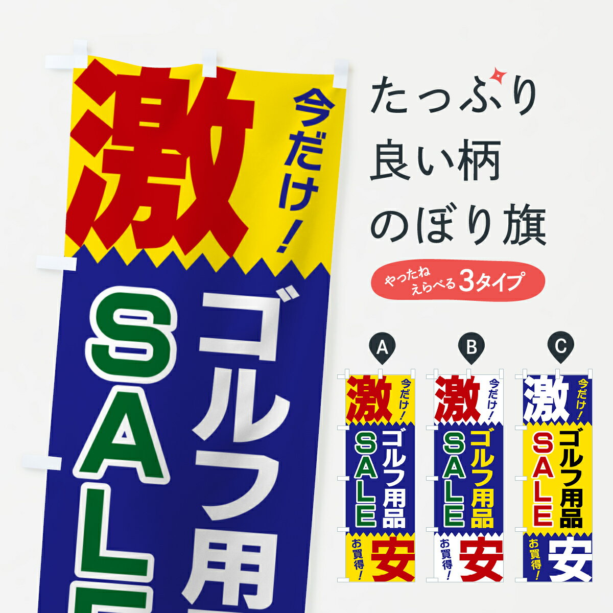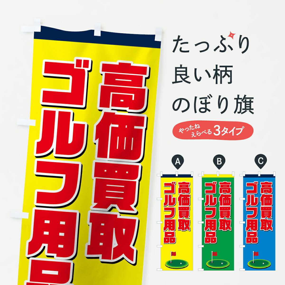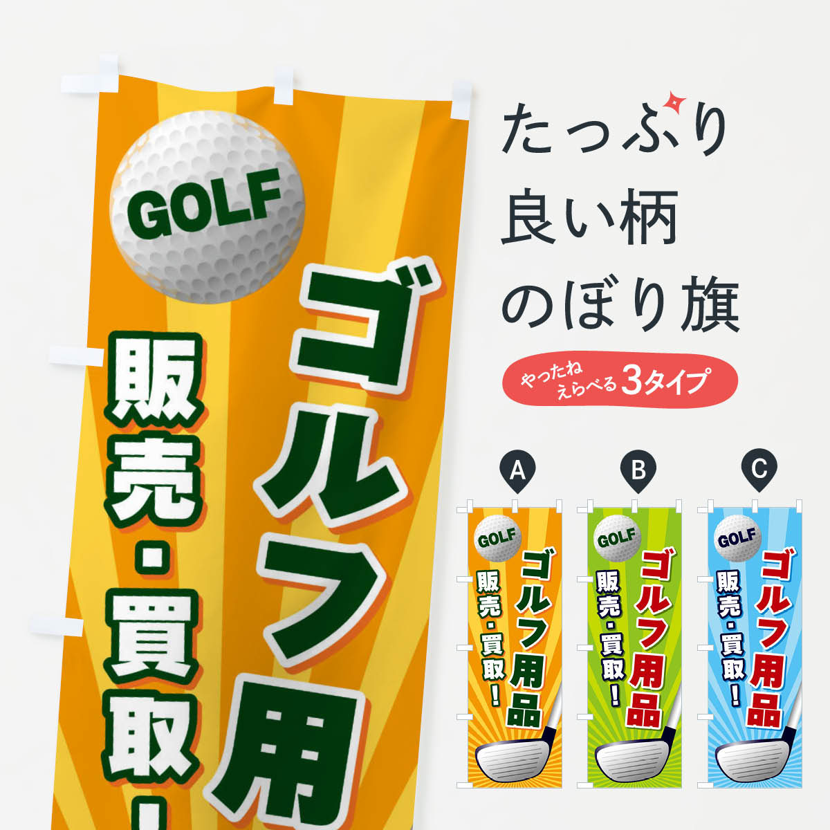グッズプロののぼり旗は「節約じょうずのぼり」から「セレブのぼり」まで細かく調整できちゃいます。のぼり旗にひと味加えて特別仕様に一部を変えたい店名、社名を入れたいもっと大きくしたい丈夫にしたい長持ちさせたい防炎加工両面別柄にしたい飾り方も選べます壁に吊るしたい全面柄で目立ちたい紐で吊りたいピンと張りたいチチ色を変えたいちょっとおしゃれに看板のようにしたいゴルフ用品のぼり旗、他にもあります。【ポスト便 送料360】 のぼり旗 ゴルフ用品・SALE・激安のぼり HTR4 グッズプロ内容・記載の文字ゴルフ用品・SALE・激安印刷自社生産 フルカラーダイレクト印刷またはシルク印刷デザイン【A】【B】【C】からお選びください。※モニターの発色によって実際のものと色が異なる場合があります。名入れ、デザイン変更(セミオーダー)などのデザイン変更が気楽にできます。以下から別途お求めください。サイズサイズの詳細については上の説明画像を御覧ください。ジャンボにしたいのぼり重量約80g素材のぼり生地:ポンジ(テトロンポンジ)一般的なのぼり旗の生地通常の薄いのぼり生地より裏抜けが減りますがとてもファンが多い良い生地です。おすすめA1ポスター:光沢紙(コート紙)チチチチとはのぼり旗にポールを通す輪っかのことです。のぼり旗が裏返ってしまうことが多い場合は右チチを試してみてください。季節により風向きが変わる場合もあります。チチの色変え※吊り下げ旗をご希望の場合はチチ無しを選択してください対応のぼりポール一般的なポールで使用できます。ポールサイズ例:最大全長3m、直径2.2cmまたは2.5cm※ポールは別売りです ポール3mのぼり包装1枚ずつ個別包装 PE袋(ポリエチレン)包装時サイズ:約20x25cm横幕に変更横幕の画像確認をご希望の場合は、決済時の備考欄に デザイン確認希望 とお書き下さい。※横幕をご希望でチチの選択がない場合は上のみのチチとなります。ご注意下さい。のぼり補強縫製見た目の美しい四辺ヒートカット仕様。ハトメ加工をご希望の場合はこちらから別途必要枚数分お求め下さい。三辺補強縫製 四辺補強縫製 棒袋縫い加工のぼり防炎加工特殊な加工のため制作にプラス2日ほどいただきます。防炎にしたい・商標権により保護されている単語ののぼり旗は、使用者が該当の商標の使用を認められている場合に限り設置できます。・設置により誤解が生じる可能性のある場合は使用できません。(使用不可な例 : AEDがないのにAEDのぼりを設置)・裏からもくっきり見せるため、風にはためくために開発された、とても薄い生地で出来ています。・屋外の使用は色あせや裁断面のほつれなどの寿命は3ヶ月・・6ヶ月です。※使用状況により異なり、屋内なら何年も持ったりします。・雨風が強い日に表に出すと寿命が縮まります。・濡れても大丈夫ですが、中途半端に濡れた状態でしまうと濡れた場所と乾いている場所に色ムラが出来る場合があります。・濡れた状態で壁などに長時間触れていると色移りをすることがあります。・通行人の目がなれる頃(3ヶ月程度)で違う色やデザインに替えるなどのローテーションをすると効果的です。・特別な事情がない限り夜間は店内にしまうなどの対応が望ましいです。・洗濯やアイロン可能ですが、扱い方により寿命に影響が出る場合があります。※オススメはしません自己責任でお願いいたします。色落ち、色移りにご注意ください。商品コード : HTR4問い合わせ時にグッズプロ楽天市場店であることと、商品コードをお伝え頂きますとスムーズです。改造・加工など、決済備考欄で商品を指定する場合は上の商品コードをお書きください。ABC【ポスト便 送料360】 のぼり旗 ゴルフ用品・SALE・激安のぼり HTR4 グッズプロ 安心ののぼり旗ブランド 「グッズプロ」が制作する、おしゃれですばらしい発色ののぼり旗。デザインを3色展開することで、カラフルに揃えたり、2色を交互にポンポンと並べて楽しさを演出できます。文字を変えたり、名入れをしたりすることで、既製品とは一味違う特別なのぼり旗にできます。 裏面の発色にもこだわった美しいのぼり旗です。のぼり旗にとって裏抜け(裏側に印刷内容が透ける)はとても重要なポイント。通常のぼり旗は表面のみの印刷のため、風で向きが変わったときや、お客様との位置関係によっては裏面になってしまう場合があります。そこで、当店ののぼり旗は表裏の見え方に差が出ないように裏抜けにこだわりました。裏抜けの美しいのグッズプロののぼり旗は裏面になってもデザインが透けて文字や写真がバッチリ見えます。裏抜けが悪いと裏面が白っぽく、色あせて見えてしまいズボラな印象に。また視認性が悪く文字が読み取りにくいなどマイナスイメージに繋がります。いろんなところで使ってほしいから、追加料金は必要ありません。裏抜けの美しいグッズプロののぼり旗でも、風でいつも裏返しでは台無しです。チチの位置を変えて風向きに沿って設
