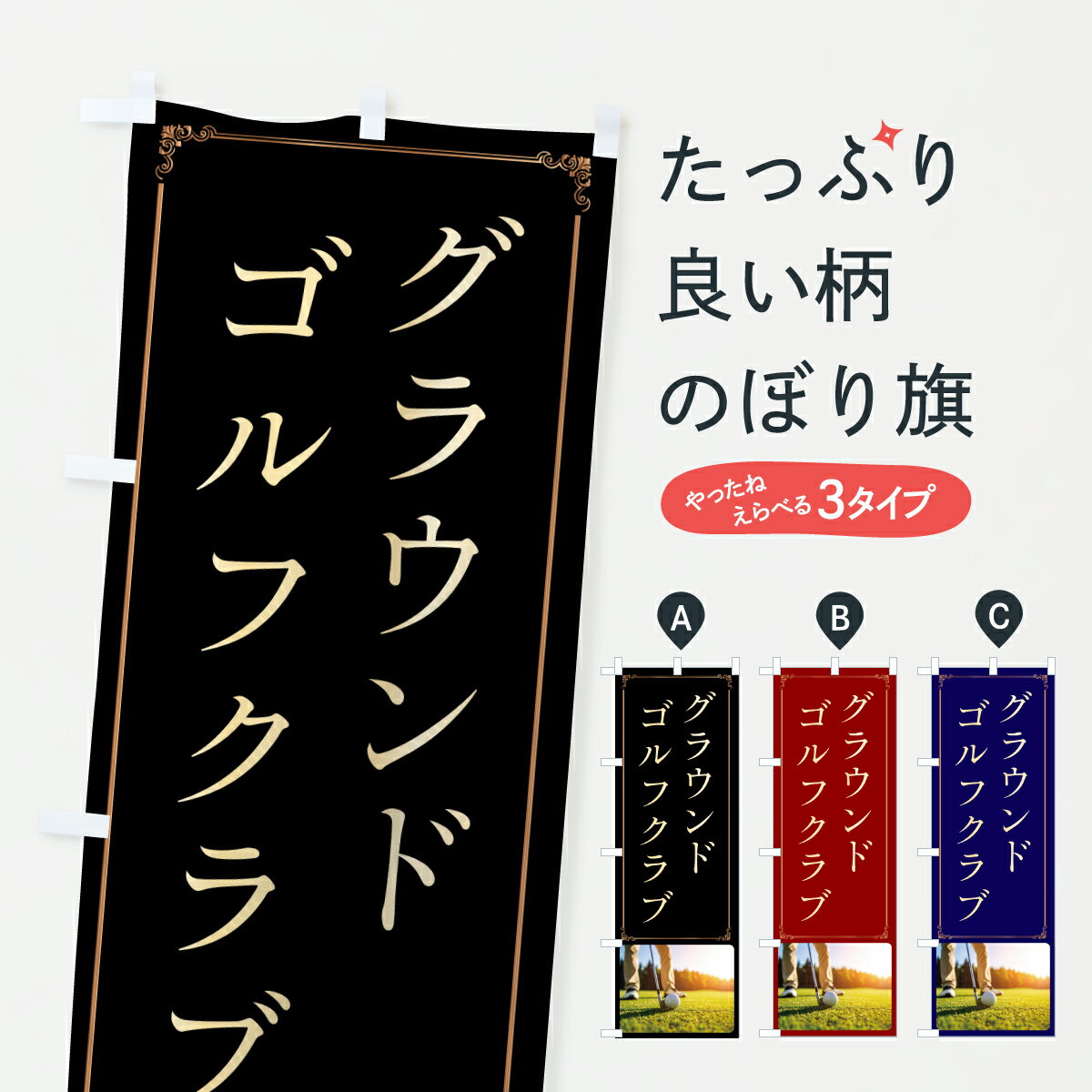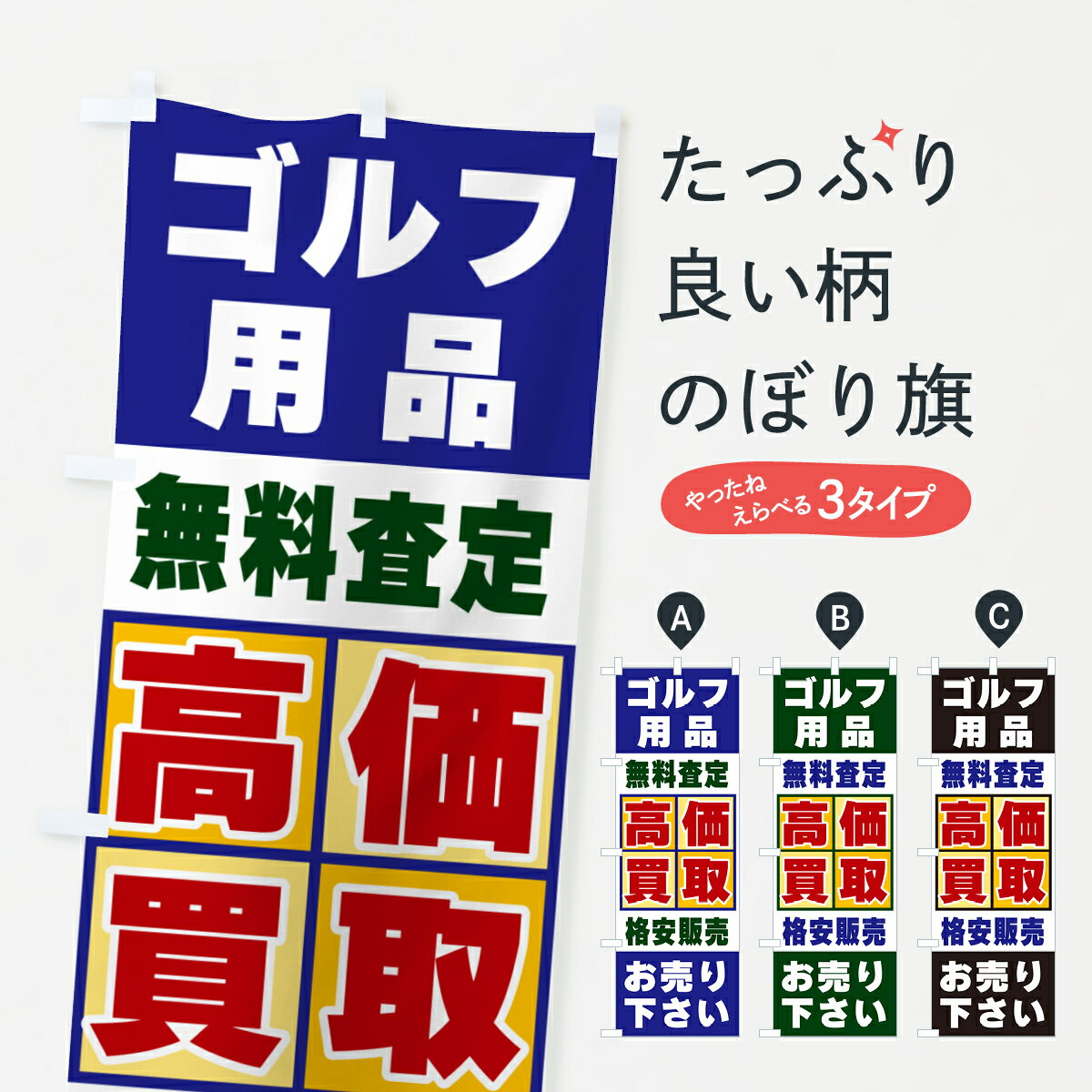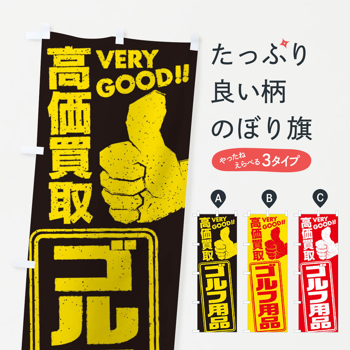 グッズプロののぼり旗は「節約じょうずのぼり」から「セレブのぼり」まで細かく調整できちゃいます。のぼり旗にひと味加えて特別仕様に一部を変えたい店名、社名を入れたいもっと大きくしたい丈夫にしたい長持ちさせたい防炎加工両面別柄にしたい飾り方も選べます壁に吊るしたい全面柄で目立ちたい紐で吊りたいピンと張りたいチチ色を変えたいちょっとおしゃれに看板のようにしたいゴルフ用品のぼり旗、他にもあります。【ポスト便 送料360】 のぼり旗 ゴルフ用品・SALE・激安のぼり HTR4 グッズプロ内容・記載の文字ゴルフ用品・SALE・激安印刷自社生産 フルカラーダイレクト印刷またはシルク印刷デザイン【A】【B】【C】からお選びください。※モニターの発色によって実際のものと色が異なる場合があります。名入れ、デザイン変更(セミオーダー)などのデザイン変更が気楽にできます。以下から別途お求めください。サイズサイズの詳細については上の説明画像を御覧ください。ジャンボにしたいのぼり重量約80g素材のぼり生地:ポンジ(テトロンポンジ)一般的なのぼり旗の生地通常の薄いのぼり生地より裏抜けが減りますがとてもファンが多い良い生地です。おすすめA1ポスター:光沢紙(コート紙)チチチチとはのぼり旗にポールを通す輪っかのことです。のぼり旗が裏返ってしまうことが多い場合は右チチを試してみてください。季節により風向きが変わる場合もあります。チチの色変え※吊り下げ旗をご希望の場合はチチ無しを選択してください対応のぼりポール一般的なポールで使用できます。ポールサイズ例:最大全長3m、直径2.2cmまたは2.5cm※ポールは別売りです ポール3mのぼり包装1枚ずつ個別包装 PE袋(ポリエチレン)包装時サイズ:約20x25cm横幕に変更横幕の画像確認をご希望の場合は、決済時の備考欄に デザイン確認希望 とお書き下さい。※横幕をご希望でチチの選択がない場合は上のみのチチとなります。ご注意下さい。のぼり補強縫製見た目の美しい四辺ヒートカット仕様。ハトメ加工をご希望の場合はこちらから別途必要枚数分お求め下さい。三辺補強縫製 四辺補強縫製 棒袋縫い加工のぼり防炎加工特殊な加工のため制作にプラス2日ほどいただきます。防炎にしたい・商標権により保護されている単語ののぼり旗は、使用者が該当の商標の使用を認められている場合に限り設置できます。・設置により誤解が生じる可能性のある場合は使用できません。(使用不可な例 : AEDがないのにAEDのぼりを設置)・裏からもくっきり見せるため、風にはためくために開発された、とても薄い生地で出来ています。・屋外の使用は色あせや裁断面のほつれなどの寿命は3ヶ月・・6ヶ月です。※使用状況により異なり、屋内なら何年も持ったりします。・雨風が強い日に表に出すと寿命が縮まります。・濡れても大丈夫ですが、中途半端に濡れた状態でしまうと濡れた場所と乾いている場所に色ムラが出来る場合があります。・濡れた状態で壁などに長時間触れていると色移りをすることがあります。・通行人の目がなれる頃(3ヶ月程度)で違う色やデザインに替えるなどのローテーションをすると効果的です。・特別な事情がない限り夜間は店内にしまうなどの対応が望ましいです。・洗濯やアイロン可能ですが、扱い方により寿命に影響が出る場合があります。※オススメはしません自己責任でお願いいたします。色落ち、色移りにご注意ください。商品コード : HTR4問い合わせ時にグッズプロ楽天市場店であることと、商品コードをお伝え頂きますとスムーズです。改造・加工など、決済備考欄で商品を指定する場合は上の商品コードをお書きください。ABC【ポスト便 送料360】 のぼり旗 ゴルフ用品・SALE・激安のぼり HTR4 グッズプロ 安心ののぼり旗ブランド 「グッズプロ」が制作する、おしゃれですばらしい発色ののぼり旗。デザインを3色展開することで、カラフルに揃えたり、2色を交互にポンポンと並べて楽しさを演出できます。文字を変えたり、名入れをしたりすることで、既製品とは一味違う特別なのぼり旗にできます。 裏面の発色にもこだわった美しいのぼり旗です。のぼり旗にとって裏抜け(裏側に印刷内容が透ける)はとても重要なポイント。通常のぼり旗は表面のみの印刷のため、風で向きが変わったときや、お客様との位置関係によっては裏面になってしまう場合があります。そこで、当店ののぼり旗は表裏の見え方に差が出ないように裏抜けにこだわりました。裏抜けの美しいのグッズプロののぼり旗は裏面になってもデザインが透けて文字や写真がバッチリ見えます。裏抜けが悪いと裏面が白っぽく、色あせて見えてしまいズボラな印象に。また視認性が悪く文字が読み取りにくいなどマイナスイメージに繋がります。いろんなところで使ってほしいから、追加料金は必要ありません。裏抜けの美しいグッズプロののぼり旗でも、風でいつも裏返しでは台無しです。チチの位置を変えて風向きに沿って設