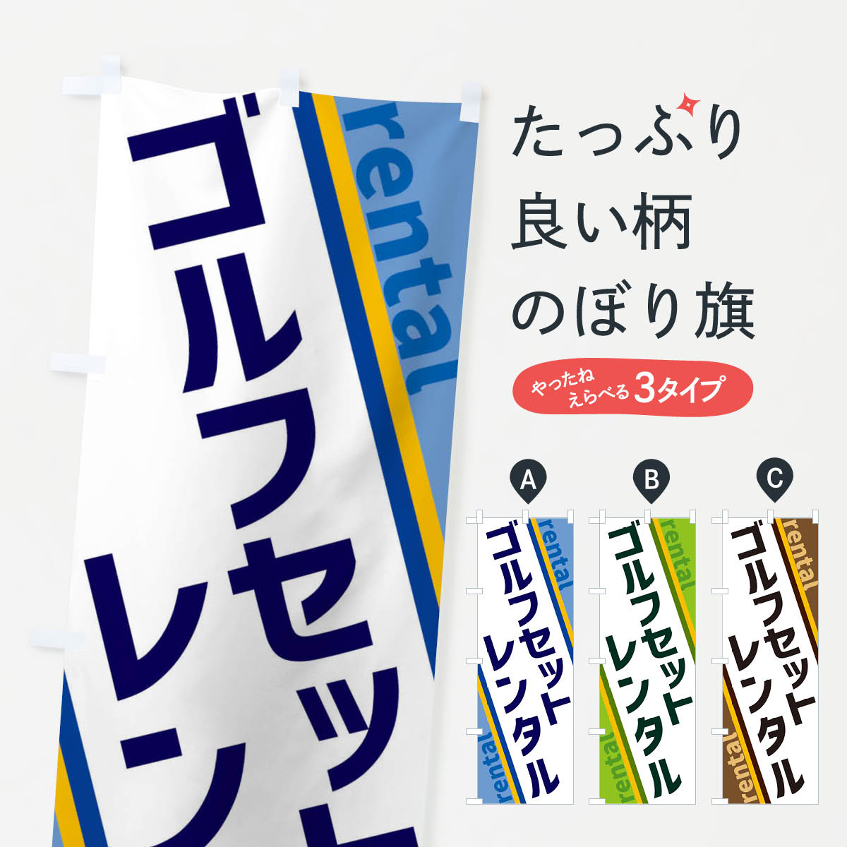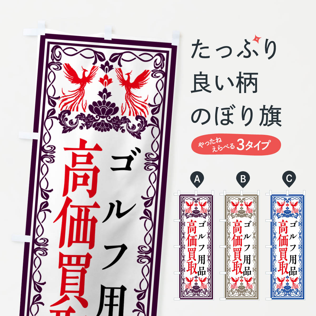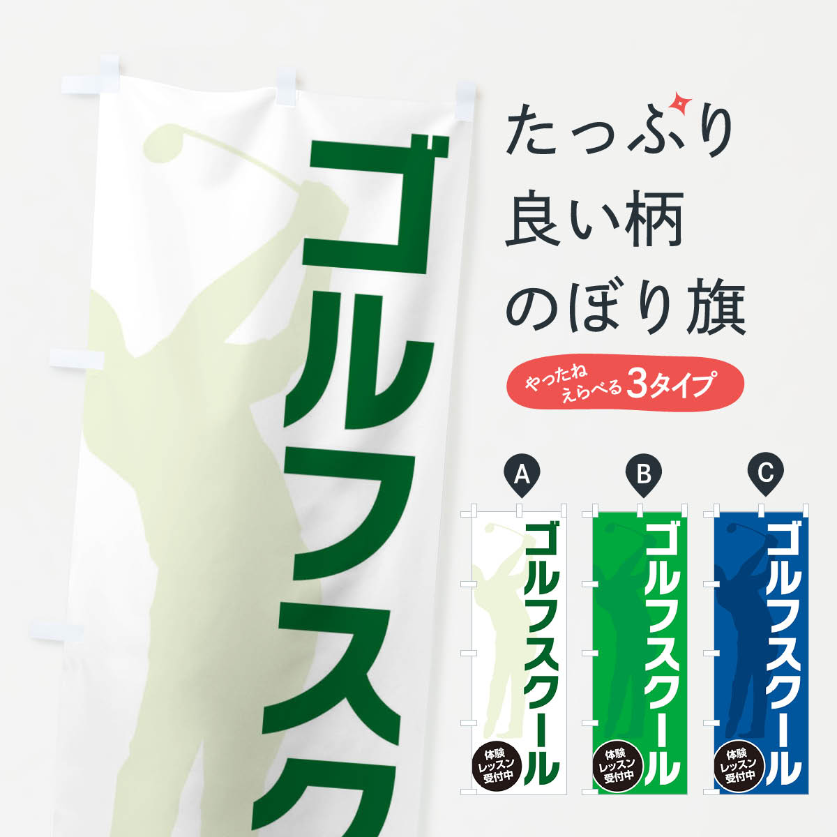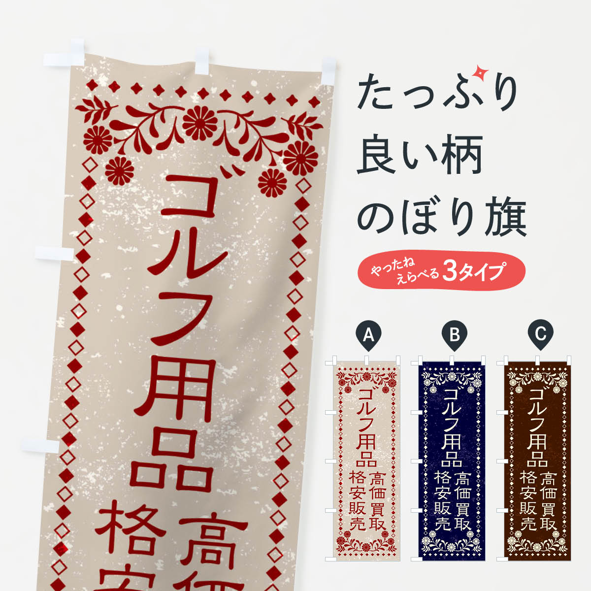 グッズプロののぼり旗は「節約じょうずのぼり」から「セレブのぼり」まで細かく調整できちゃいます。のぼり旗にひと味加えて特別仕様に一部を変えたい店名、社名を入れたいもっと大きくしたい丈夫にしたい長持ちさせたい防炎加工両面別柄にしたい飾り方も選べます壁に吊るしたい全面柄で目立ちたい紐で吊りたいピンと張りたいチチ色を変えたいちょっとおしゃれに看板のようにしたいゴルフ用品のぼり旗、他にもあります。【ポスト便 送料360】 のぼり旗 ゴルフ用品・SALE・激安のぼり HTR4 グッズプロ内容・記載の文字ゴルフ用品・SALE・激安印刷自社生産 フルカラーダイレクト印刷またはシルク印刷デザイン【A】【B】【C】からお選びください。※モニターの発色によって実際のものと色が異なる場合があります。名入れ、デザイン変更(セミオーダー)などのデザイン変更が気楽にできます。以下から別途お求めください。サイズサイズの詳細については上の説明画像を御覧ください。ジャンボにしたいのぼり重量約80g素材のぼり生地:ポンジ(テトロンポンジ)一般的なのぼり旗の生地通常の薄いのぼり生地より裏抜けが減りますがとてもファンが多い良い生地です。おすすめA1ポスター:光沢紙(コート紙)チチチチとはのぼり旗にポールを通す輪っかのことです。のぼり旗が裏返ってしまうことが多い場合は右チチを試してみてください。季節により風向きが変わる場合もあります。チチの色変え※吊り下げ旗をご希望の場合はチチ無しを選択してください対応のぼりポール一般的なポールで使用できます。ポールサイズ例:最大全長3m、直径2.2cmまたは2.5cm※ポールは別売りです ポール3mのぼり包装1枚ずつ個別包装 PE袋(ポリエチレン)包装時サイズ:約20x25cm横幕に変更横幕の画像確認をご希望の場合は、決済時の備考欄に デザイン確認希望 とお書き下さい。※横幕をご希望でチチの選択がない場合は上のみのチチとなります。ご注意下さい。のぼり補強縫製見た目の美しい四辺ヒートカット仕様。ハトメ加工をご希望の場合はこちらから別途必要枚数分お求め下さい。三辺補強縫製 四辺補強縫製 棒袋縫い加工のぼり防炎加工特殊な加工のため制作にプラス2日ほどいただきます。防炎にしたい・商標権により保護されている単語ののぼり旗は、使用者が該当の商標の使用を認められている場合に限り設置できます。・設置により誤解が生じる可能性のある場合は使用できません。(使用不可な例 : AEDがないのにAEDのぼりを設置)・裏からもくっきり見せるため、風にはためくために開発された、とても薄い生地で出来ています。・屋外の使用は色あせや裁断面のほつれなどの寿命は3ヶ月・・6ヶ月です。※使用状況により異なり、屋内なら何年も持ったりします。・雨風が強い日に表に出すと寿命が縮まります。・濡れても大丈夫ですが、中途半端に濡れた状態でしまうと濡れた場所と乾いている場所に色ムラが出来る場合があります。・濡れた状態で壁などに長時間触れていると色移りをすることがあります。・通行人の目がなれる頃(3ヶ月程度)で違う色やデザインに替えるなどのローテーションをすると効果的です。・特別な事情がない限り夜間は店内にしまうなどの対応が望ましいです。・洗濯やアイロン可能ですが、扱い方により寿命に影響が出る場合があります。※オススメはしません自己責任でお願いいたします。色落ち、色移りにご注意ください。商品コード : HTR4問い合わせ時にグッズプロ楽天市場店であることと、商品コードをお伝え頂きますとスムーズです。改造・加工など、決済備考欄で商品を指定する場合は上の商品コードをお書きください。ABC【ポスト便 送料360】 のぼり旗 ゴルフ用品・SALE・激安のぼり HTR4 グッズプロ 安心ののぼり旗ブランド 「グッズプロ」が制作する、おしゃれですばらしい発色ののぼり旗。デザインを3色展開することで、カラフルに揃えたり、2色を交互にポンポンと並べて楽しさを演出できます。文字を変えたり、名入れをしたりすることで、既製品とは一味違う特別なのぼり旗にできます。 裏面の発色にもこだわった美しいのぼり旗です。のぼり旗にとって裏抜け(裏側に印刷内容が透ける)はとても重要なポイント。通常のぼり旗は表面のみの印刷のため、風で向きが変わったときや、お客様との位置関係によっては裏面になってしまう場合があります。そこで、当店ののぼり旗は表裏の見え方に差が出ないように裏抜けにこだわりました。裏抜けの美しいのグッズプロののぼり旗は裏面になってもデザインが透けて文字や写真がバッチリ見えます。裏抜けが悪いと裏面が白っぽく、色あせて見えてしまいズボラな印象に。また視認性が悪く文字が読み取りにくいなどマイナスイメージに繋がります。いろんなところで使ってほしいから、追加料金は必要ありません。裏抜けの美しいグッズプロののぼり旗でも、風でいつも裏返しでは台無しです。チチの位置を変えて風向きに沿って設