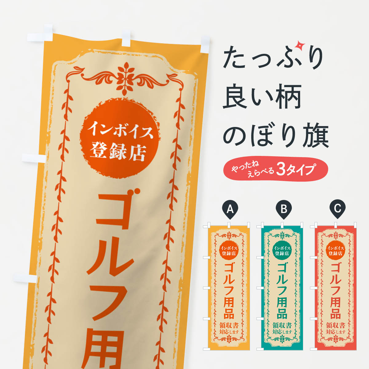 グッズプロののぼり旗は「節約じょうずのぼり」から「セレブのぼり」まで細かく調整できちゃいます。のぼり旗にひと味加えて特別仕様に一部を変えたい店名、社名を入れたいもっと大きくしたい丈夫にしたい長持ちさせたい防炎加工両面別柄にしたい飾り方も選べます壁に吊るしたい全面柄で目立ちたい紐で吊りたいピンと張りたいチチ色を変えたいちょっとおしゃれに看板のようにしたいゴルフ用品のぼり旗、他にもあります。【ポスト便 送料360】 のぼり旗 ゴルフ用品・インボイス登録店のぼり NJCX 内容・記載の文字ゴルフ用品・インボイス登録店印刷自社生産 フルカラーダイレクト印刷またはシルク印刷デザイン【A】【B】【C】からお選びください。※モニターの発色によって実際のものと色が異なる場合があります。名入れ、デザイン変更(セミオーダー)などのデザイン変更が気楽にできます。以下から別途お求めください。サイズサイズの詳細については上の説明画像を御覧ください。ジャンボにしたいのぼり重量約80g素材のぼり生地:ポンジ(テトロンポンジ)一般的なのぼり旗の生地通常の薄いのぼり生地より裏抜けが減りますがとてもファンが多い良い生地です。おすすめA1ポスター:光沢紙(コート紙)チチチチとはのぼり旗にポールを通す輪っかのことです。のぼり旗が裏返ってしまうことが多い場合は右チチを試してみてください。季節により風向きが変わる場合もあります。チチの色変え※吊り下げ旗をご希望の場合はチチ無しを選択してください対応のぼりポール一般的なポールで使用できます。ポールサイズ例:最大全長3m、直径2.2cmまたは2.5cm※ポールは別売りです ポール3mのぼり包装1枚ずつ個別包装 PE袋(ポリエチレン)包装時サイズ:約20x25cm横幕に変更横幕の画像確認をご希望の場合は、決済時の備考欄に デザイン確認希望 とお書き下さい。※横幕をご希望でチチの選択がない場合は上のみのチチとなります。ご注意下さい。のぼり補強縫製見た目の美しい四辺ヒートカット仕様。ハトメ加工をご希望の場合はこちらから別途必要枚数分お求め下さい。三辺補強縫製 四辺補強縫製 棒袋縫い加工のぼり防炎加工特殊な加工のため制作にプラス2日ほどいただきます。防炎にしたい・商標権により保護されている単語ののぼり旗は、使用者が該当の商標の使用を認められている場合に限り設置できます。・設置により誤解が生じる可能性のある場合は使用できません。(使用不可な例 : AEDがないのにAEDのぼりを設置)・裏からもくっきり見せるため、風にはためくために開発された、とても薄い生地で出来ています。・屋外の使用は色あせや裁断面のほつれなどの寿命は3ヶ月〜6ヶ月です。※使用状況により異なり、屋内なら何年も持ったりします。・雨風が強い日に表に出すと寿命が縮まります。・濡れても大丈夫ですが、中途半端に濡れた状態でしまうと濡れた場所と乾いている場所に色ムラが出来る場合があります。・濡れた状態で壁などに長時間触れていると色移りをすることがあります。・通行人の目がなれる頃(3ヶ月程度)で違う色やデザインに替えるなどのローテーションをすると効果的です。・特別な事情がない限り夜間は店内にしまうなどの対応が望ましいです。・洗濯やアイロン可能ですが、扱い方により寿命に影響が出る場合があります。※オススメはしません自己責任でお願いいたします。色落ち、色移りにご注意ください。商品コード : NJCX問い合わせ時にグッズプロ楽天市場店であることと、商品コードをお伝え頂きますとスムーズです。改造・加工など、決済備考欄で商品を指定する場合は上の商品コードをお書きください。ABC【ポスト便 送料360】 のぼり旗 ゴルフ用品・インボイス登録店のぼり NJCX 安心ののぼり旗ブランド 「グッズプロ」が制作する、おしゃれですばらしい発色ののぼり旗。デザインを3色展開することで、カラフルに揃えたり、2色を交互にポンポンと並べて楽しさを演出できます。文字を変えたり、名入れをしたりすることで、既製品とは一味違う特別なのぼり旗にできます。 裏面の発色にもこだわった美しいのぼり旗です。のぼり旗にとって裏抜け(裏側に印刷内容が透ける)はとても重要なポイント。通常のぼり旗は表面のみの印刷のため、風で向きが変わったときや、お客様との位置関係によっては裏面になってしまう場合があります。そこで、当店ののぼり旗は表裏の見え方に差が出ないように裏抜けにこだわりました。裏抜けの美しいのグッズプロののぼり旗は裏面になってもデザインが透けて文字や写真がバッチリ見えます。裏抜けが悪いと裏面が白っぽく、色あせて見えてしまいズボラな印象に。また視認性が悪く文字が読み取りにくいなどマイナスイメージに繋がります。いろんなところで使ってほしいから、追加料金は必要ありません。裏抜けの美しいグッズプロののぼり旗でも、風でいつも裏返しでは台無しです。チチの位置を変えて風向きに沿って設置
