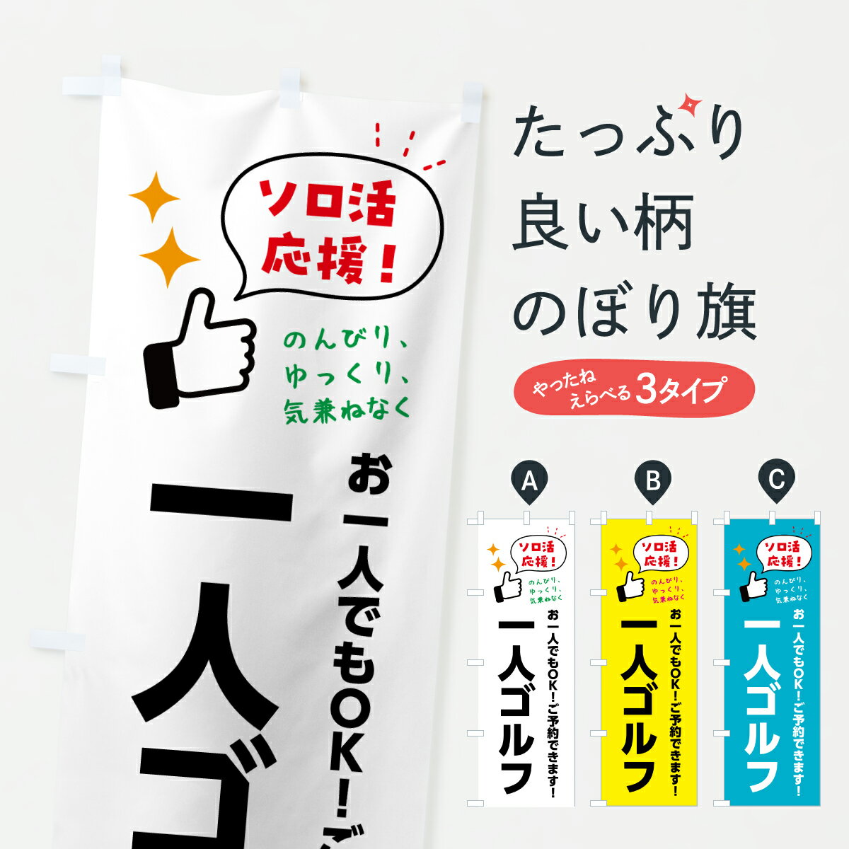 グッズプロののぼり旗は「節約じょうずのぼり」から「セレブのぼり」まで細かく調整できちゃいます。のぼり旗にひと味加えて特別仕様に一部を変えたい店名、社名を入れたいもっと大きくしたい丈夫にしたい長持ちさせたい防炎加工両面別柄にしたい飾り方も選べます壁に吊るしたい全面柄で目立ちたい紐で吊りたいピンと張りたいチチ色を変えたいちょっとおしゃれに看板のようにしたいゴルフ場・ミニゴルフのぼり旗、他にもあります。【ポスト便 送料360】 のぼり旗 一人ゴルフ・ソロ活のぼり H876 ゴルフ場・ミニゴルフ グッズプロ内容・記載の文字一人ゴルフ・ソロ活印刷自社生産 フルカラーダイレクト印刷またはシルク印刷デザイン【A】【B】【C】からお選びください。※モニターの発色によって実際のものと色が異なる場合があります。名入れ、デザイン変更(セミオーダー)などのデザイン変更が気楽にできます。以下から別途お求めください。サイズサイズの詳細については上の説明画像を御覧ください。ジャンボにしたいのぼり重量約80g素材のぼり生地:ポンジ(テトロンポンジ)一般的なのぼり旗の生地通常の薄いのぼり生地より裏抜けが減りますがとてもファンが多い良い生地です。おすすめA1ポスター:光沢紙(コート紙)チチチチとはのぼり旗にポールを通す輪っかのことです。のぼり旗が裏返ってしまうことが多い場合は右チチを試してみてください。季節により風向きが変わる場合もあります。チチの色変え※吊り下げ旗をご希望の場合はチチ無しを選択してください対応のぼりポール一般的なポールで使用できます。ポールサイズ例:最大全長3m、直径2.2cmまたは2.5cm※ポールは別売りです ポール3mのぼり包装1枚ずつ個別包装 PE袋(ポリエチレン)包装時サイズ:約20x25cm横幕に変更横幕の画像確認をご希望の場合は、決済時の備考欄に デザイン確認希望 とお書き下さい。※横幕をご希望でチチの選択がない場合は上のみのチチとなります。ご注意下さい。のぼり補強縫製見た目の美しい四辺ヒートカット仕様。ハトメ加工をご希望の場合はこちらから別途必要枚数分お求め下さい。三辺補強縫製 四辺補強縫製 棒袋縫い加工のぼり防炎加工特殊な加工のため制作にプラス2日ほどいただきます。防炎にしたい・商標権により保護されている単語ののぼり旗は、使用者が該当の商標の使用を認められている場合に限り設置できます。・設置により誤解が生じる可能性のある場合は使用できません。(使用不可な例 : AEDがないのにAEDのぼりを設置)・裏からもくっきり見せるため、風にはためくために開発された、とても薄い生地で出来ています。・屋外の使用は色あせや裁断面のほつれなどの寿命は3ヶ月・・6ヶ月です。※使用状況により異なり、屋内なら何年も持ったりします。・雨風が強い日に表に出すと寿命が縮まります。・濡れても大丈夫ですが、中途半端に濡れた状態でしまうと濡れた場所と乾いている場所に色ムラが出来る場合があります。・濡れた状態で壁などに長時間触れていると色移りをすることがあります。・通行人の目がなれる頃(3ヶ月程度)で違う色やデザインに替えるなどのローテーションをすると効果的です。・特別な事情がない限り夜間は店内にしまうなどの対応が望ましいです。・洗濯やアイロン可能ですが、扱い方により寿命に影響が出る場合があります。※オススメはしません自己責任でお願いいたします。色落ち、色移りにご注意ください。商品コード : H876問い合わせ時にグッズプロ楽天市場店であることと、商品コードをお伝え頂きますとスムーズです。改造・加工など、決済備考欄で商品を指定する場合は上の商品コードをお書きください。ABC【ポスト便 送料360】 のぼり旗 一人ゴルフ・ソロ活のぼり H876 ゴルフ場・ミニゴルフ グッズプロ 安心ののぼり旗ブランド 「グッズプロ」が制作する、おしゃれですばらしい発色ののぼり旗。デザインを3色展開することで、カラフルに揃えたり、2色を交互にポンポンと並べて楽しさを演出できます。文字を変えたり、名入れをしたりすることで、既製品とは一味違う特別なのぼり旗にできます。 裏面の発色にもこだわった美しいのぼり旗です。のぼり旗にとって裏抜け(裏側に印刷内容が透ける)はとても重要なポイント。通常のぼり旗は表面のみの印刷のため、風で向きが変わったときや、お客様との位置関係によっては裏面になってしまう場合があります。そこで、当店ののぼり旗は表裏の見え方に差が出ないように裏抜けにこだわりました。裏抜けの美しいのグッズプロののぼり旗は裏面になってもデザインが透けて文字や写真がバッチリ見えます。裏抜けが悪いと裏面が白っぽく、色あせて見えてしまいズボラな印象に。また視認性が悪く文字が読み取りにくいなどマイナスイメージに繋がります。いろんなところで使ってほしいから、追加料金は必要ありません。裏抜けの美しいグッズプロののぼり旗でも、風でいつも裏返しでは台無