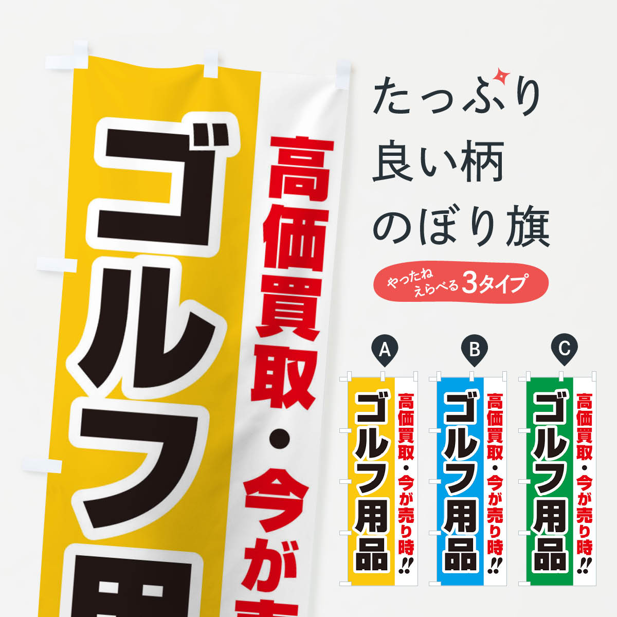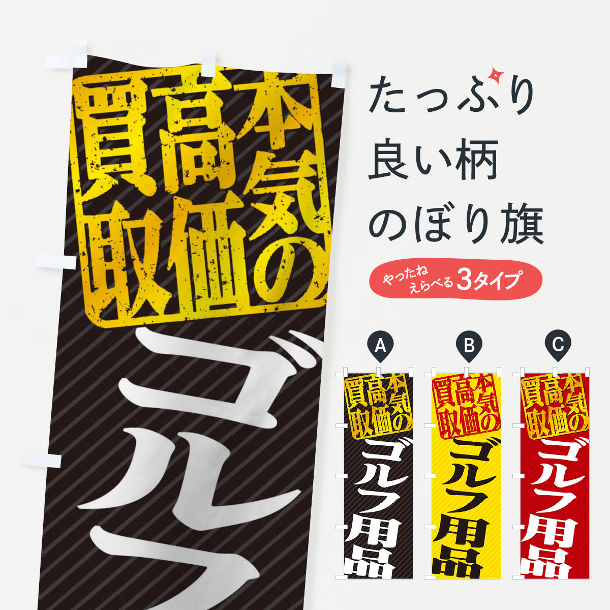 グッズプロののぼり旗は「節約じょうずのぼり」から「セレブのぼり」まで細かく調整できちゃいます。のぼり旗にひと味加えて特別仕様に一部を変えたい店名、社名を入れたいもっと大きくしたい丈夫にしたい長持ちさせたい防炎加工両面別柄にしたい飾り方も選べます壁に吊るしたい全面柄で目立ちたい紐で吊りたいピンと張りたいチチ色を変えたいちょっとおしゃれに看板のようにしたいゴルフ用品のぼり旗、他にもあります。【ネコポス送料360】 のぼり旗 ゴルフ用品・高価買取・書道・筆書きのぼり 4H1Y 内容・記載の文字ゴルフ用品・高価買取・書道・筆書き印刷自社生産 フルカラーダイレクト印刷またはシルク印刷デザイン【A】【B】【C】からお選びください。※モニターの発色によって実際のものと色が異なる場合があります。名入れ、デザイン変更(セミオーダー)などのデザイン変更が気楽にできます。以下から別途お求めください。サイズサイズの詳細については上の説明画像を御覧ください。ジャンボにしたいのぼり重量約80g素材のぼり生地:ポンジ(テトロンポンジ)一般的なのぼり旗の生地通常の薄いのぼり生地より裏抜けが減りますがとてもファンが多い良い生地です。おすすめA1ポスター:光沢紙(コート紙)チチチチとはのぼり旗にポールを通す輪っかのことです。のぼり旗が裏返ってしまうことが多い場合は右チチを試してみてください。季節により風向きが変わる場合もあります。チチの色変え※吊り下げ旗をご希望の場合はチチ無しを選択してください対応のぼりポール一般的なポールで使用できます。ポールサイズ例:最大全長3m、直径2.2cmまたは2.5cm※ポールは別売りです ポール3mのぼり包装1枚ずつ個別包装 PE袋(ポリエチレン)包装時サイズ:約20x25cm横幕に変更横幕の画像確認をご希望の場合は、決済時の備考欄に デザイン確認希望 とお書き下さい。※横幕をご希望でチチの選択がない場合は上のみのチチとなります。ご注意下さい。のぼり補強縫製見た目の美しい四辺ヒートカット仕様。ハトメ加工をご希望の場合はこちらから別途必要枚数分お求め下さい。三辺補強縫製 四辺補強縫製 棒袋縫い加工のぼり防炎加工特殊な加工のため制作にプラス2日ほどいただきます。防炎にしたい・商標権により保護されている単語ののぼり旗は、使用者が該当の商標の使用を認められている場合に限り設置できます。・設置により誤解が生じる可能性のある場合は使用できません。(使用不可な例 : AEDがないのにAEDのぼりを設置)・裏からもくっきり見せるため、風にはためくために開発された、とても薄い生地で出来ています。・屋外の使用は色あせや裁断面のほつれなどの寿命は3ヶ月〜6ヶ月です。※使用状況により異なり、屋内なら何年も持ったりします。・雨風が強い日に表に出すと寿命が縮まります。・濡れても大丈夫ですが、中途半端に濡れた状態でしまうと濡れた場所と乾いている場所に色ムラが出来る場合があります。・濡れた状態で壁などに長時間触れていると色移りをすることがあります。・通行人の目がなれる頃(3ヶ月程度)で違う色やデザインに替えるなどのローテーションをすると効果的です。・特別な事情がない限り夜間は店内にしまうなどの対応が望ましいです。・洗濯やアイロン可能ですが、扱い方により寿命に影響が出る場合があります。※オススメはしません自己責任でお願いいたします。色落ち、色移りにご注意ください。商品コード : 4H1Y問い合わせ時にグッズプロ楽天市場店であることと、商品コードをお伝え頂きますとスムーズです。改造・加工など、決済備考欄で商品を指定する場合は上の商品コードをお書きください。ABC【ネコポス送料360】 のぼり旗 ゴルフ用品・高価買取・書道・筆書きのぼり 4H1Y 安心ののぼり旗ブランド 「グッズプロ」が制作する、おしゃれですばらしい発色ののぼり旗。デザインを3色展開することで、カラフルに揃えたり、2色を交互にポンポンと並べて楽しさを演出できます。文字を変えたり、名入れをしたりすることで、既製品とは一味違う特別なのぼり旗にできます。 裏面の発色にもこだわった美しいのぼり旗です。のぼり旗にとって裏抜け(裏側に印刷内容が透ける)はとても重要なポイント。通常のぼり旗は表面のみの印刷のため、風で向きが変わったときや、お客様との位置関係によっては裏面になってしまう場合があります。そこで、当店ののぼり旗は表裏の見え方に差が出ないように裏抜けにこだわりました。裏抜けの美しいのグッズプロののぼり旗は裏面になってもデザインが透けて文字や写真がバッチリ見えます。裏抜けが悪いと裏面が白っぽく、色あせて見えてしまいズボラな印象に。また視認性が悪く文字が読み取りにくいなどマイナスイメージに繋がります。いろんなところで使ってほしいから、追加料金は必要ありません。裏抜けの美しいグッズプロののぼり旗でも、風でいつも裏返しでは台無しです。チチの位置を変えて