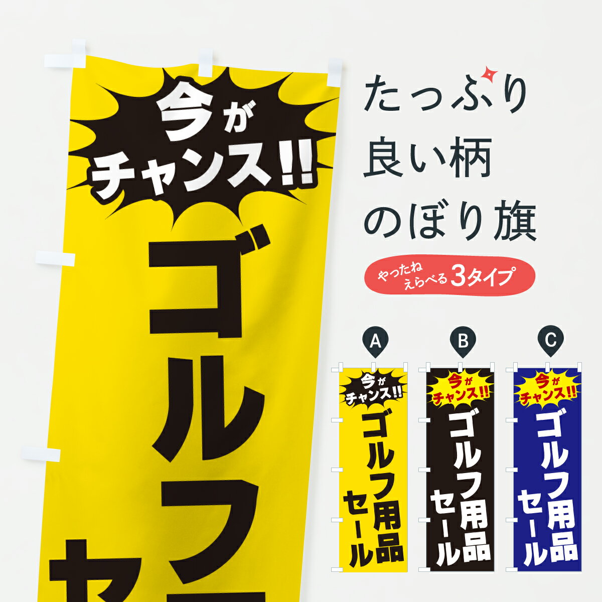 グッズプロののぼり旗は「節約じょうずのぼり」から「セレブのぼり」まで細かく調整できちゃいます。のぼり旗にひと味加えて特別仕様に一部を変えたい店名、社名を入れたいもっと大きくしたい丈夫にしたい長持ちさせたい防炎加工両面別柄にしたい飾り方も選べます壁に吊るしたい全面柄で目立ちたい紐で吊りたいピンと張りたいチチ色を変えたいちょっとおしゃれに看板のようにしたいゴルフ用品のぼり旗、他にもあります。【ポスト便 送料360】 のぼり旗 ゴルフ用品セール・今がチャンスのぼり JA2N グッズプロ内容・記載の文字ゴルフ用品セール・今がチャンス印刷自社生産 フルカラーダイレクト印刷またはシルク印刷デザイン【A】【B】【C】からお選びください。※モニターの発色によって実際のものと色が異なる場合があります。名入れ、デザイン変更(セミオーダー)などのデザイン変更が気楽にできます。以下から別途お求めください。サイズサイズの詳細については上の説明画像を御覧ください。ジャンボにしたいのぼり重量約80g素材のぼり生地:ポンジ(テトロンポンジ)一般的なのぼり旗の生地通常の薄いのぼり生地より裏抜けが減りますがとてもファンが多い良い生地です。おすすめA1ポスター:光沢紙(コート紙)チチチチとはのぼり旗にポールを通す輪っかのことです。のぼり旗が裏返ってしまうことが多い場合は右チチを試してみてください。季節により風向きが変わる場合もあります。チチの色変え※吊り下げ旗をご希望の場合はチチ無しを選択してください対応のぼりポール一般的なポールで使用できます。ポールサイズ例:最大全長3m、直径2.2cmまたは2.5cm※ポールは別売りです ポール3mのぼり包装1枚ずつ個別包装 PE袋(ポリエチレン)包装時サイズ:約20x25cm横幕に変更横幕の画像確認をご希望の場合は、決済時の備考欄に デザイン確認希望 とお書き下さい。※横幕をご希望でチチの選択がない場合は上のみのチチとなります。ご注意下さい。のぼり補強縫製見た目の美しい四辺ヒートカット仕様。ハトメ加工をご希望の場合はこちらから別途必要枚数分お求め下さい。三辺補強縫製 四辺補強縫製 棒袋縫い加工のぼり防炎加工特殊な加工のため制作にプラス2日ほどいただきます。防炎にしたい・商標権により保護されている単語ののぼり旗は、使用者が該当の商標の使用を認められている場合に限り設置できます。・設置により誤解が生じる可能性のある場合は使用できません。(使用不可な例 : AEDがないのにAEDのぼりを設置)・裏からもくっきり見せるため、風にはためくために開発された、とても薄い生地で出来ています。・屋外の使用は色あせや裁断面のほつれなどの寿命は3ヶ月・・6ヶ月です。※使用状況により異なり、屋内なら何年も持ったりします。・雨風が強い日に表に出すと寿命が縮まります。・濡れても大丈夫ですが、中途半端に濡れた状態でしまうと濡れた場所と乾いている場所に色ムラが出来る場合があります。・濡れた状態で壁などに長時間触れていると色移りをすることがあります。・通行人の目がなれる頃(3ヶ月程度)で違う色やデザインに替えるなどのローテーションをすると効果的です。・特別な事情がない限り夜間は店内にしまうなどの対応が望ましいです。・洗濯やアイロン可能ですが、扱い方により寿命に影響が出る場合があります。※オススメはしません自己責任でお願いいたします。色落ち、色移りにご注意ください。商品コード : JA2N問い合わせ時にグッズプロ楽天市場店であることと、商品コードをお伝え頂きますとスムーズです。改造・加工など、決済備考欄で商品を指定する場合は上の商品コードをお書きください。ABC【ポスト便 送料360】 のぼり旗 ゴルフ用品セール・今がチャンスのぼり JA2N グッズプロ 安心ののぼり旗ブランド 「グッズプロ」が制作する、おしゃれですばらしい発色ののぼり旗。デザインを3色展開することで、カラフルに揃えたり、2色を交互にポンポンと並べて楽しさを演出できます。文字を変えたり、名入れをしたりすることで、既製品とは一味違う特別なのぼり旗にできます。 裏面の発色にもこだわった美しいのぼり旗です。のぼり旗にとって裏抜け(裏側に印刷内容が透ける)はとても重要なポイント。通常のぼり旗は表面のみの印刷のため、風で向きが変わったときや、お客様との位置関係によっては裏面になってしまう場合があります。そこで、当店ののぼり旗は表裏の見え方に差が出ないように裏抜けにこだわりました。裏抜けの美しいのグッズプロののぼり旗は裏面になってもデザインが透けて文字や写真がバッチリ見えます。裏抜けが悪いと裏面が白っぽく、色あせて見えてしまいズボラな印象に。また視認性が悪く文字が読み取りにくいなどマイナスイメージに繋がります。いろんなところで使ってほしいから、追加料金は必要ありません。裏抜けの美しいグッズプロののぼり旗でも、風でいつも裏返しでは台無しです。チチの