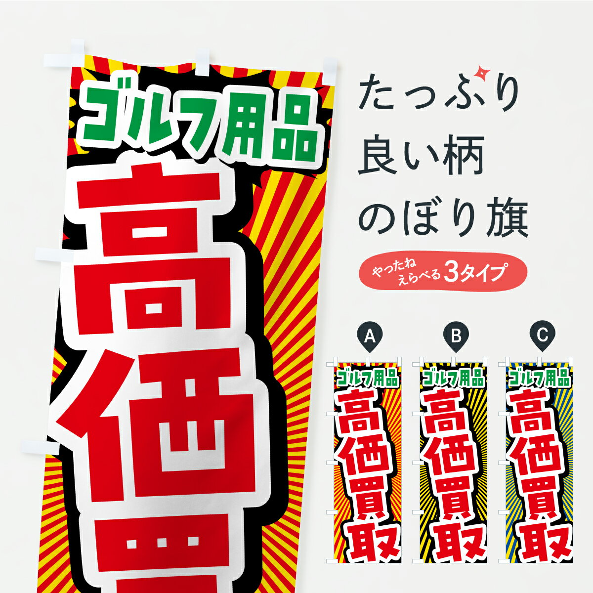グッズプロののぼり旗は「節約じょうずのぼり」から「セレブのぼり」まで細かく調整できちゃいます。のぼり旗にひと味加えて特別仕様に一部を変えたい店名、社名を入れたいもっと大きくしたい丈夫にしたい長持ちさせたい防炎加工両面別柄にしたい飾り方も選べます壁に吊るしたい全面柄で目立ちたい紐で吊りたいピンと張りたいチチ色を変えたいちょっとおしゃれに看板のようにしたいゴルフ用品のぼり旗、他にもあります。【ポスト便 送料360】 のぼり旗 ゴルフ用品・高価買取・リサイクルショップのぼり CP2U グッズプロ 【名入れできます】内容・記載の文字ゴルフ用品・高価買取・リサイクルショップ印刷自社生産 フルカラーダイレクト印刷またはシルク印刷デザイン【A】【B】【C】からお選びください。※モニターの発色によって実際のものと色が異なる場合があります。名入れ、デザイン変更(セミオーダー)などのデザイン変更が気楽にできます。以下から別途お求めください。サイズサイズの詳細については上の説明画像を御覧ください。ジャンボにしたいのぼり重量約80g素材のぼり生地:ポンジ(テトロンポンジ)一般的なのぼり旗の生地通常の薄いのぼり生地より裏抜けが減りますがとてもファンが多い良い生地です。おすすめA1ポスター:光沢紙(コート紙)チチチチとはのぼり旗にポールを通す輪っかのことです。のぼり旗が裏返ってしまうことが多い場合は右チチを試してみてください。季節により風向きが変わる場合もあります。チチの色変え※吊り下げ旗をご希望の場合はチチ無しを選択してください対応のぼりポール一般的なポールで使用できます。ポールサイズ例:最大全長3m、直径2.2cmまたは2.5cm※ポールは別売りです ポール3mのぼり包装1枚ずつ個別包装 PE袋(ポリエチレン)包装時サイズ:約20x25cm横幕に変更横幕の画像確認をご希望の場合は、決済時の備考欄に デザイン確認希望 とお書き下さい。※横幕をご希望でチチの選択がない場合は上のみのチチとなります。ご注意下さい。のぼり補強縫製見た目の美しい四辺ヒートカット仕様。ハトメ加工をご希望の場合はこちらから別途必要枚数分お求め下さい。三辺補強縫製 四辺補強縫製 棒袋縫い加工のぼり防炎加工特殊な加工のため制作にプラス2日ほどいただきます。防炎にしたい・商標権により保護されている単語ののぼり旗は、使用者が該当の商標の使用を認められている場合に限り設置できます。・設置により誤解が生じる可能性のある場合は使用できません。(使用不可な例 : AEDがないのにAEDのぼりを設置)・裏からもくっきり見せるため、風にはためくために開発された、とても薄い生地で出来ています。・屋外の使用は色あせや裁断面のほつれなどの寿命は3ヶ月・・6ヶ月です。※使用状況により異なり、屋内なら何年も持ったりします。・雨風が強い日に表に出すと寿命が縮まります。・濡れても大丈夫ですが、中途半端に濡れた状態でしまうと濡れた場所と乾いている場所に色ムラが出来る場合があります。・濡れた状態で壁などに長時間触れていると色移りをすることがあります。・通行人の目がなれる頃(3ヶ月程度)で違う色やデザインに替えるなどのローテーションをすると効果的です。・特別な事情がない限り夜間は店内にしまうなどの対応が望ましいです。・洗濯やアイロン可能ですが、扱い方により寿命に影響が出る場合があります。※オススメはしません自己責任でお願いいたします。色落ち、色移りにご注意ください。商品コード : CP2U問い合わせ時にグッズプロ楽天市場店であることと、商品コードをお伝え頂きますとスムーズです。改造・加工など、決済備考欄で商品を指定する場合は上の商品コードをお書きください。ABC【ポスト便 送料360】 のぼり旗 ゴルフ用品・高価買取・リサイクルショップのぼり CP2U グッズプロ 【名入れできます】 安心ののぼり旗ブランド 「グッズプロ」が制作する、おしゃれですばらしい発色ののぼり旗。デザインを3色展開することで、カラフルに揃えたり、2色を交互にポンポンと並べて楽しさを演出できます。文字を変えたり、名入れをしたりすることで、既製品とは一味違う特別なのぼり旗にできます。 裏面の発色にもこだわった美しいのぼり旗です。のぼり旗にとって裏抜け(裏側に印刷内容が透ける)はとても重要なポイント。通常のぼり旗は表面のみの印刷のため、風で向きが変わったときや、お客様との位置関係によっては裏面になってしまう場合があります。そこで、当店ののぼり旗は表裏の見え方に差が出ないように裏抜けにこだわりました。裏抜けの美しいのグッズプロののぼり旗は裏面になってもデザインが透けて文字や写真がバッチリ見えます。裏抜けが悪いと裏面が白っぽく、色あせて見えてしまいズボラな印象に。また視認性が悪く文字が読み取りにくいなどマイナスイメージに繋がります。いろんなところで使ってほしいから、追加料金は必要ありません。裏抜けの美し