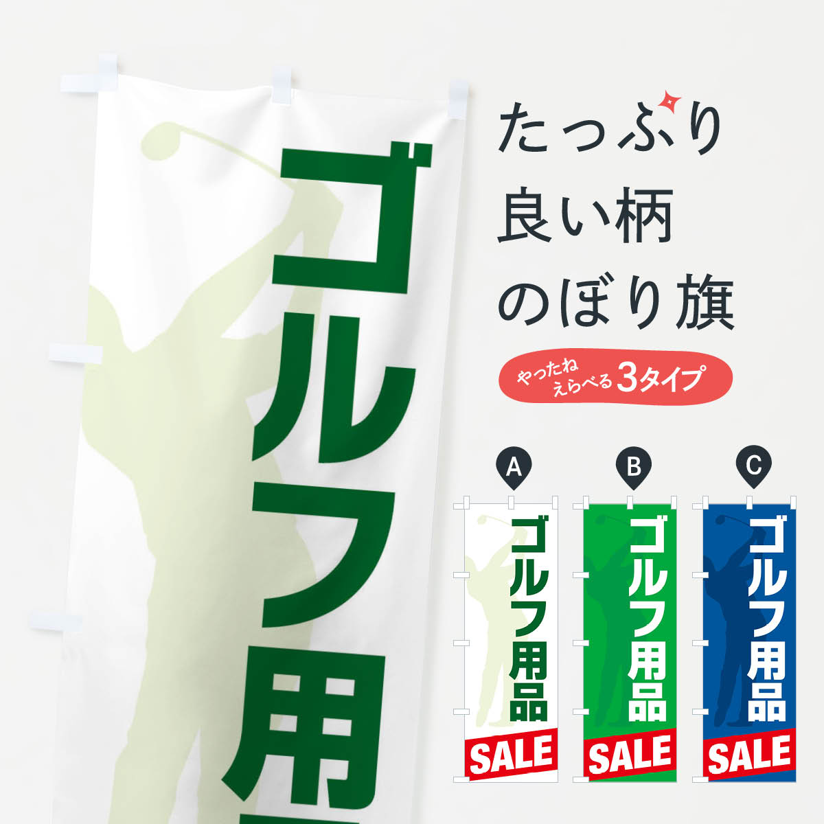 グッズプロののぼり旗は「節約じょうずのぼり」から「セレブのぼり」まで細かく調整できちゃいます。のぼり旗にひと味加えて特別仕様に一部を変えたい店名、社名を入れたいもっと大きくしたい丈夫にしたい長持ちさせたい防炎加工両面別柄にしたい飾り方も選べます壁に吊るしたい全面柄で目立ちたい紐で吊りたいピンと張りたいチチ色を変えたいちょっとおしゃれに看板のようにしたいゴルフ用品のぼり旗、他にもあります。【ポスト便 送料360】 のぼり旗 ゴルフ用品・SALE・激安のぼり HTR4 グッズプロ内容・記載の文字ゴルフ用品・SALE・激安印刷自社生産 フルカラーダイレクト印刷またはシルク印刷デザイン【A】【B】【C】からお選びください。※モニターの発色によって実際のものと色が異なる場合があります。名入れ、デザイン変更(セミオーダー)などのデザイン変更が気楽にできます。以下から別途お求めください。サイズサイズの詳細については上の説明画像を御覧ください。ジャンボにしたいのぼり重量約80g素材のぼり生地:ポンジ(テトロンポンジ)一般的なのぼり旗の生地通常の薄いのぼり生地より裏抜けが減りますがとてもファンが多い良い生地です。おすすめA1ポスター:光沢紙(コート紙)チチチチとはのぼり旗にポールを通す輪っかのことです。のぼり旗が裏返ってしまうことが多い場合は右チチを試してみてください。季節により風向きが変わる場合もあります。チチの色変え※吊り下げ旗をご希望の場合はチチ無しを選択してください対応のぼりポール一般的なポールで使用できます。ポールサイズ例:最大全長3m、直径2.2cmまたは2.5cm※ポールは別売りです ポール3mのぼり包装1枚ずつ個別包装 PE袋(ポリエチレン)包装時サイズ:約20x25cm横幕に変更横幕の画像確認をご希望の場合は、決済時の備考欄に デザイン確認希望 とお書き下さい。※横幕をご希望でチチの選択がない場合は上のみのチチとなります。ご注意下さい。のぼり補強縫製見た目の美しい四辺ヒートカット仕様。ハトメ加工をご希望の場合はこちらから別途必要枚数分お求め下さい。三辺補強縫製 四辺補強縫製 棒袋縫い加工のぼり防炎加工特殊な加工のため制作にプラス2日ほどいただきます。防炎にしたい・商標権により保護されている単語ののぼり旗は、使用者が該当の商標の使用を認められている場合に限り設置できます。・設置により誤解が生じる可能性のある場合は使用できません。(使用不可な例 : AEDがないのにAEDのぼりを設置)・裏からもくっきり見せるため、風にはためくために開発された、とても薄い生地で出来ています。・屋外の使用は色あせや裁断面のほつれなどの寿命は3ヶ月・・6ヶ月です。※使用状況により異なり、屋内なら何年も持ったりします。・雨風が強い日に表に出すと寿命が縮まります。・濡れても大丈夫ですが、中途半端に濡れた状態でしまうと濡れた場所と乾いている場所に色ムラが出来る場合があります。・濡れた状態で壁などに長時間触れていると色移りをすることがあります。・通行人の目がなれる頃(3ヶ月程度)で違う色やデザインに替えるなどのローテーションをすると効果的です。・特別な事情がない限り夜間は店内にしまうなどの対応が望ましいです。・洗濯やアイロン可能ですが、扱い方により寿命に影響が出る場合があります。※オススメはしません自己責任でお願いいたします。色落ち、色移りにご注意ください。商品コード : HTR4問い合わせ時にグッズプロ楽天市場店であることと、商品コードをお伝え頂きますとスムーズです。改造・加工など、決済備考欄で商品を指定する場合は上の商品コードをお書きください。ABC【ポスト便 送料360】 のぼり旗 ゴルフ用品・SALE・激安のぼり HTR4 グッズプロ 安心ののぼり旗ブランド 「グッズプロ」が制作する、おしゃれですばらしい発色ののぼり旗。デザインを3色展開することで、カラフルに揃えたり、2色を交互にポンポンと並べて楽しさを演出できます。文字を変えたり、名入れをしたりすることで、既製品とは一味違う特別なのぼり旗にできます。 裏面の発色にもこだわった美しいのぼり旗です。のぼり旗にとって裏抜け(裏側に印刷内容が透ける)はとても重要なポイント。通常のぼり旗は表面のみの印刷のため、風で向きが変わったときや、お客様との位置関係によっては裏面になってしまう場合があります。そこで、当店ののぼり旗は表裏の見え方に差が出ないように裏抜けにこだわりました。裏抜けの美しいのグッズプロののぼり旗は裏面になってもデザインが透けて文字や写真がバッチリ見えます。裏抜けが悪いと裏面が白っぽく、色あせて見えてしまいズボラな印象に。また視認性が悪く文字が読み取りにくいなどマイナスイメージに繋がります。いろんなところで使ってほしいから、追加料金は必要ありません。裏抜けの美しいグッズプロののぼり旗でも、風でいつも裏返しでは台無しです。チチの位置を変えて風向きに沿って設