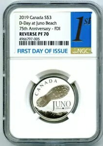2019 $3 カナダ シルバー NGC PF70 リバース プルーフ D-DAY ジュノ ビーチ - 初日発行!