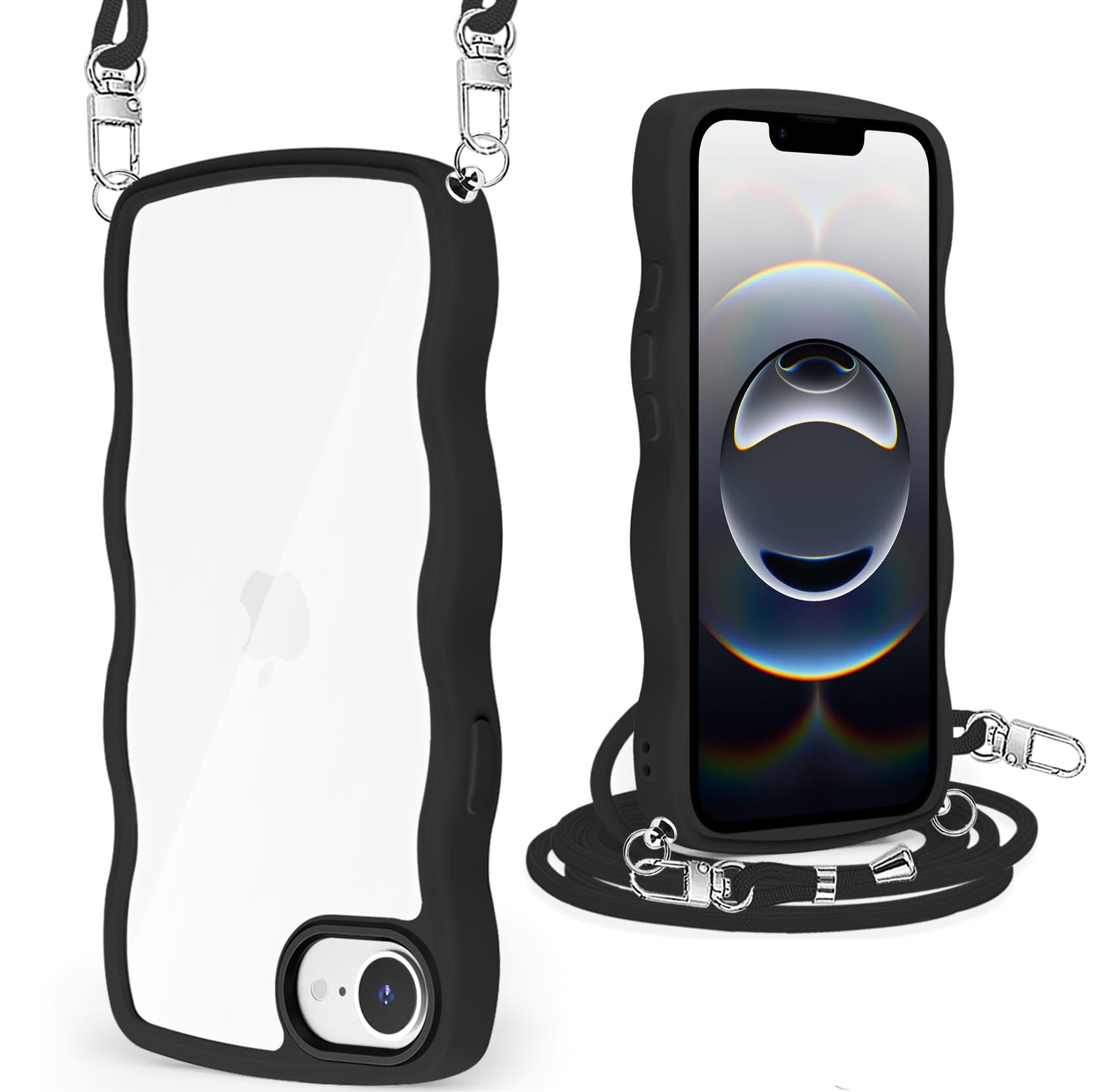 iPhone 16E ケース クリア ショルダー アイフォン 16e カバー うねうね 透明 人気 かわいい 耐衝撃 スマホケース ストラップ付き 取り外し可能 長さ調整可能 首かけ 肩掛け 薄型 軽量 TPU ワイヤレス充電対応(ブラック)