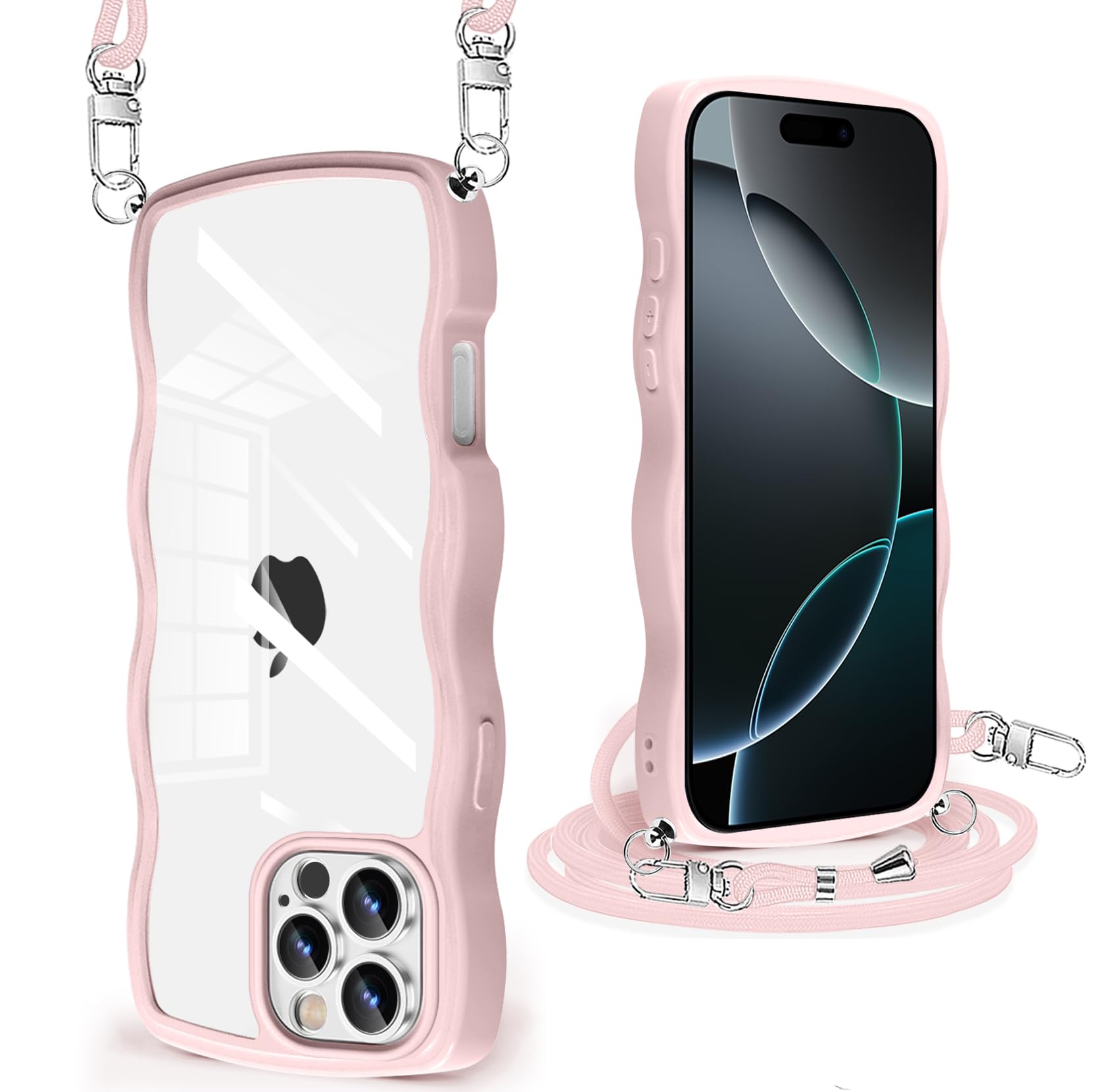 iPhone 16 Pro Max 用 ケース クリア ショルダー ストラップ付き アイフォン 16 Pro Max 用 カバー かわいい 波状フレーム 人気 耐衝撃 透明 iPhone16 Pro Max 用 スマホケース 首かけ 肩掛け 薄型 軽量 Q