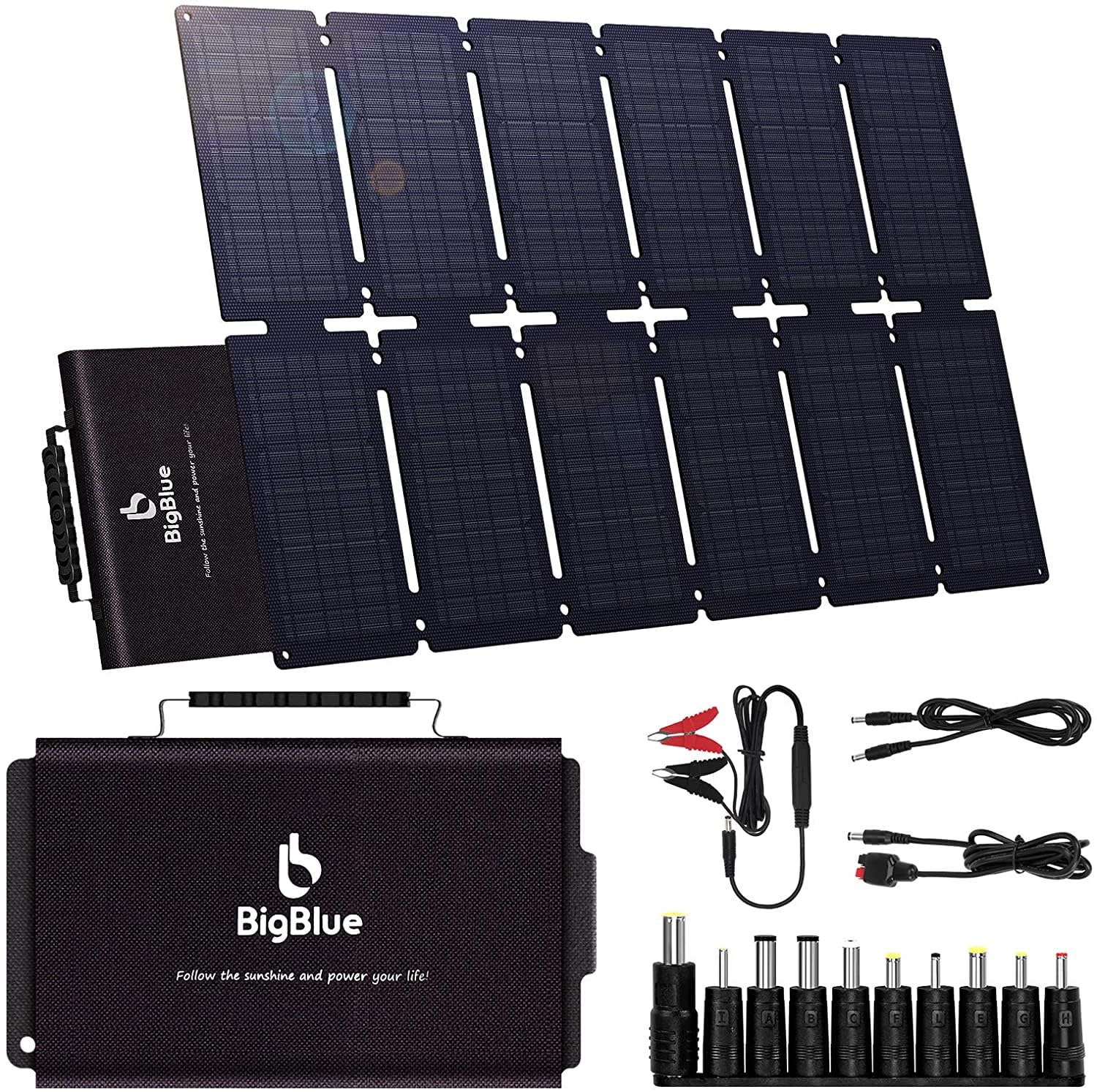 ・【高い転換効率ETFEソーラーチャージャー】超高い発電効率を実現できる単結晶ETFEシリコン型高効率ソーラーパネルを12枚搭載し、太陽光を最大限利用できます。ETFEパネルを採用され、他の種類のシリコン系パネルに比べて変化効率が高く、転換効率は22%に達し、電力は最大100Wの大出力、太陽光によってエネルギー供給できます。太陽光パネルの発電量は、太陽光パネルを設置する方角や角度によっても異なります。方角は南向き、角度は30度(南向きの場合)はソーラーチャージャーの転化率が最高です。・【PD60W急速充電】ソーラーチャージャーはとして、DC出力ポート(12-19V 5.2A(max))、PD出力ポート(20V/3A (最大))、QC3.0出力ポート(5V3A / 9V3A / 12V3A / 20V3A (最大))とUSB出力ポート (5V3A / 9V2A / 12V1.5A (最大))が搭載しており、4台のデバイスを同時充電可能です。保護システムを内蔵しており、ソーラーパネルとデバイスの安全性を保証します。また、ソーラーパネルはシステムの寿命にわたってより多くのエネルギーを生成し、耐久性があるばかりでなく、性能を向上させます。・【ICテクノロジー採用のソーラーチャージャー】BigBlueのソーラーチャージャーは安全性に優れ、USB安定出力システムとICテクノロジー保護システムを内蔵しており、最適な充電性能が持ちます。接続されたデバイスを自動的に検知し、ソーラーチャージャーとデバイスの安全性を保証できます。ソーラーパネルの過熱や過電流、過充電などを防止するばかりでなく、USB出力ポートとDC出力ポートと装備し、ポータブル電源やノートパソコンにソーラー充電することができます。・【コンパクト&ポータブル電源対応】コンパクト(折り畳み時約385 * 209 * 80mm、展開時約1238 * 774 * 3.4mm)かつ軽量で、重量はわずか4kgで、取っ手もついているので持ち運びもしやすいで、アウトドア、キャンプや車中泊など最適です。また、DC-DCケーブルと10種類DC変換プラグ(K:7.9*5.6*0.9mm、A:6.0*4.3*1.4mm、B:6.3*3.0mm、C:5.5*2.5mm、E:5.5*1.7mm、F:4.8*1.7mm、G:4.0*1.7mm、H:3.5*1.35mm、L:3.0*1.1mm、I:2.5*0.7mm )とDC-アンダーソンケーブルがあり、ポータブル電源対応できるばかりでなく、キャンプ、キャンピングカー、テント、船舶、防災など様々な用途で使用できます。・【防水、耐久性ソーラーパネルとカスタマーサービス】ソーラーパネルは防水と耐久性が高い素材を採用し、屋外用に設計されています。小雨でも、気にせず、旅行や車中泊はもちろん、地震の備え、停電後の生活も支えます。ご注文日から18ヶ月の保証期間を提供させて頂くサービスですが、無期間のカスタマーサポートを提供致します。
