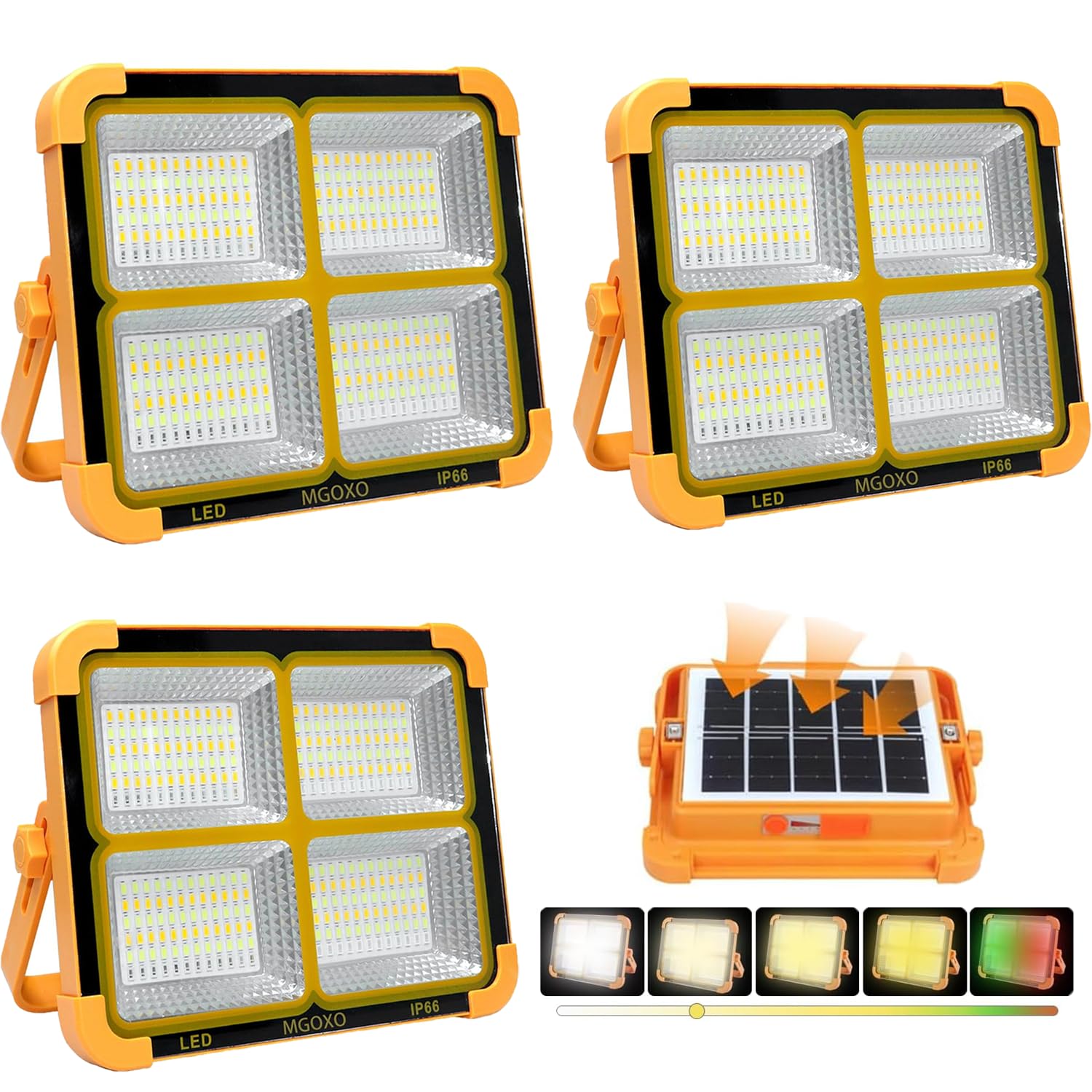 MGOXO 投光器(3個)LED 充電式 作業灯 16000mAH大容量 超高輝度 240W 15000LM ソーラー充電/Type-c充電 便携式 5色切替 無段階調光 太陽光発電 IP66防水 磁気設計 折り畳み式 アウトドア キャンプ 夜釣り登山 日