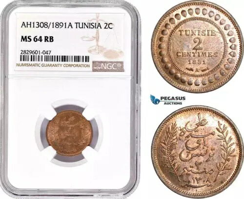 AD241、チュニジア、2 サンタイム AH1308 / 1891-A、パリ、NGC MS64RB、ポップ 3/3