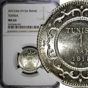 チュニジア ムハンマド 5 世 シルバー AH1334 (1915) A 1 フラン NGC MS63 GEM BU KM# 238 (037)
