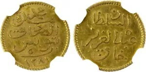 チュニジア - オスマン帝国、ゴールド 5 ピアストル アブドゥル アジズ 1281 Ah NGC AU 55、レア 9