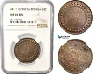 AC446 チュニジア、フランス保護領、10 サンタイム AH1310 (1892) A、パリ、NGC MS61