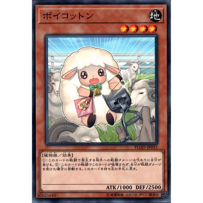 遊戯王OCG デュエルモンスターズ YU-GI-OH! 『FLAMES OF DESTRUCTION (フレイムズ・オブ・デストラクション)』収録 FLOD-JP035 ボイコットン (ボイコットン) 【NR:ノーマルレア】 属性:地 レベル:4 種族:植物族 その他項目:効果 攻撃力:1000 守備力:2500 ▼カードテキスト カードテキスト (1):このカードの戦闘で発生する相手への戦闘ダメージは代わりに自分が受ける。(2):このカードの戦闘でこのカードが破壊されず、自分が戦闘ダメージを受けた場合に発動する。このカードを持ち主の手札に戻す。
