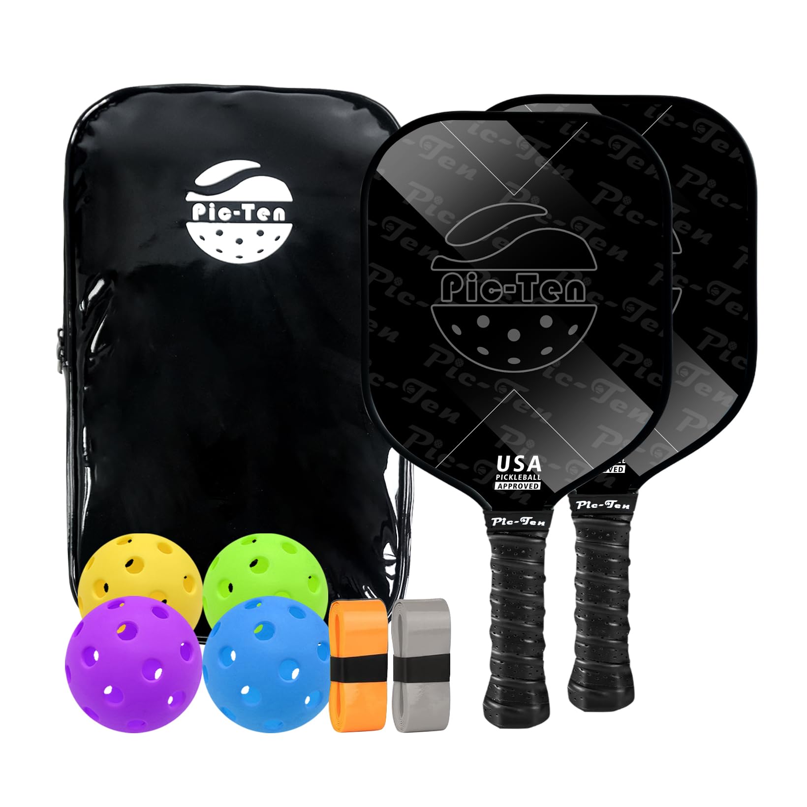 Pic-Ten ピックルボールパドル 2個セット USAPA承認 カーボンファイバー表面(CHS) 高性能設計 軽量 ポリプロピレンハニカムコア 滑り止め吸汗グリップ ピックルボール4個 ピックルボールリードベルト2個 ポータブルキャリーバッグ