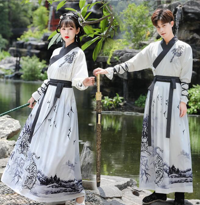 コスプレ衣装 漢服 唐装 中華服 上下セット メンズレディース ハロウィン衣装 ユニセックス 華流コスプレ 仮装 チャイナ服虎柄 山水 中国古代コスチューム チャイナ風舞台ステージ衣装 トップス ゴングスカート 和風 着物 白地に黒プリント 送料無料
