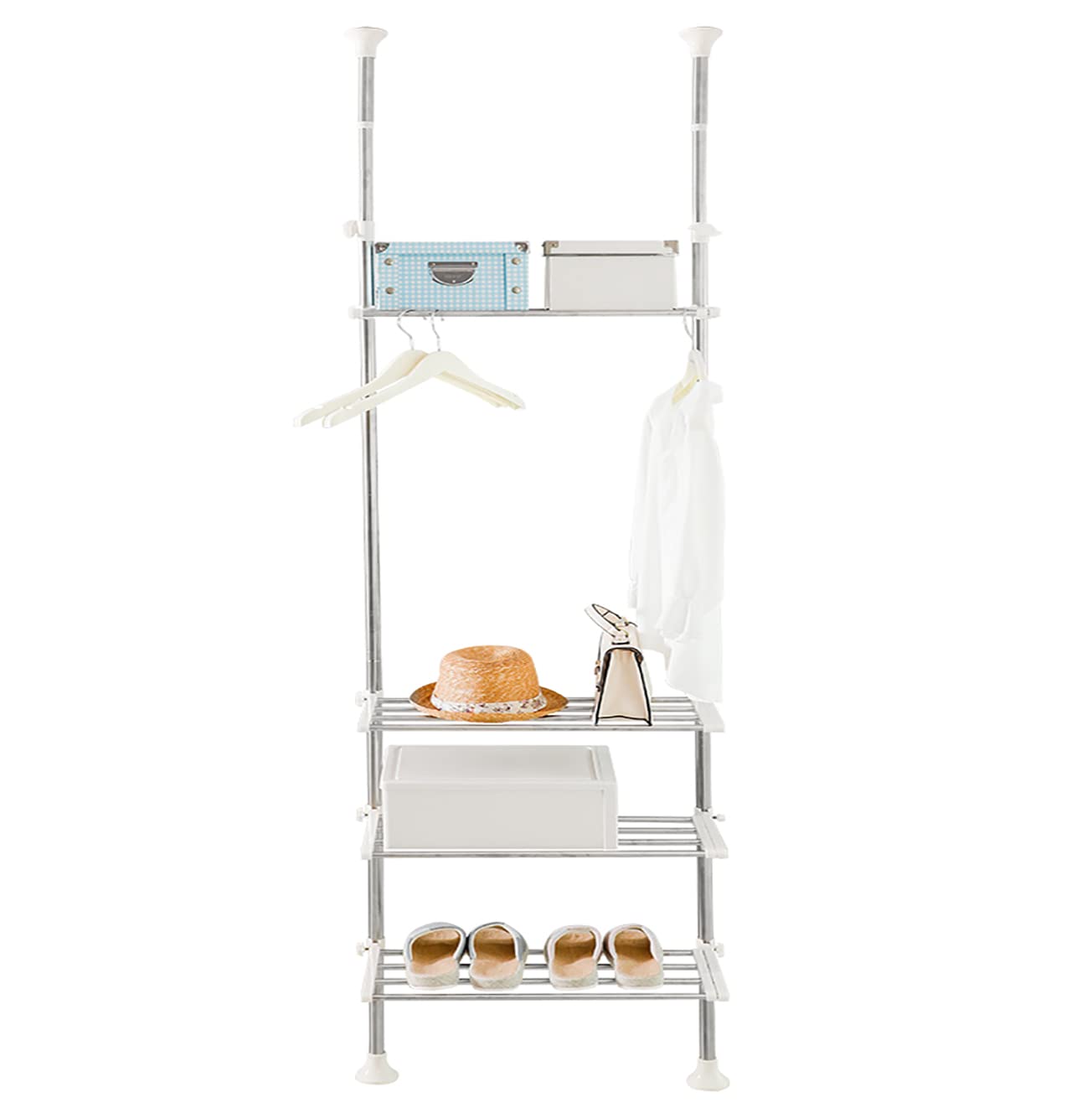 ・使用サイズ(約):幅55-97X奥行29X高さ218-295cm、自宅の洗濯スペースに合わせ棚を無段階調節できる、つっぱり洗濯機ラック。・重量(約):5kg、材質:ステンレス/ABS・耐荷重(約):全体20kg、棚板1枚あたり5kg・上部内蔵スプリング:パイプを天井と床に突っ張るだけで設置が可能。高さ違いの場所へも対応できます。・組み立てが簡単:簡単組み立て/工具不要、穴をあける必要がなく、ゆかいたや天井を損傷しない。4段棚でたっぷりと収納できます。