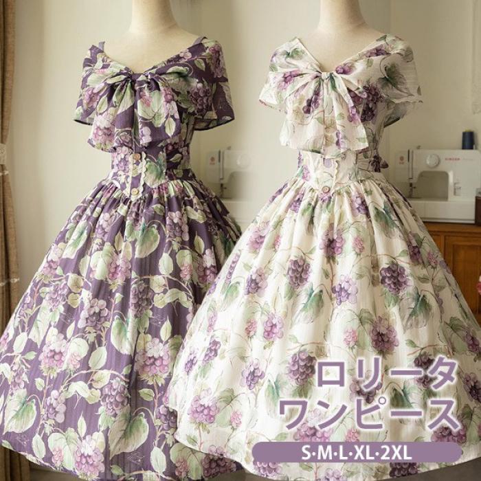 ロリータ ワンピース グレープ柄 春夏用 ミモレ丈 半袖 リボン パフスリーブ レディース フレアスカート クラロリ ゴスロリ レトロ風 リゾートワンピ ハイウエスト Aライン 上品 ロリータファッション フリル ロリータワンピース 日常着 お出かけ 旅行 バカンス