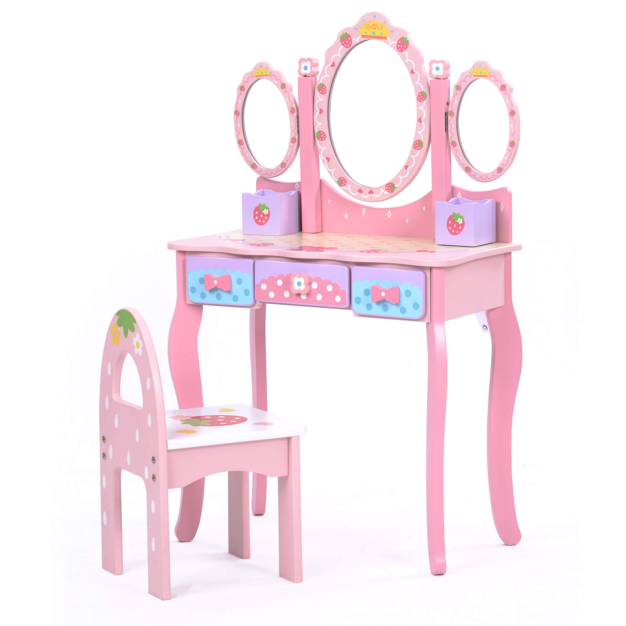 ・【中段300°回転できる三面鏡設計】 330°回転できるミラーは様々な角度でもチェックできます。かわいイチゴデザインは、お子様にお姫様気分を感じられます。・【高品質木製】 中密度繊維板を使用しています。丈夫な素材なので、長くお使い頂けます。【割れにくいミラー】 厚めのアクリルミラーで綺麗に映ります。・【エコ塗装を採用】 水性塗装は、汚れにくく、水に濡れてもサッと拭き取ることができます。【角丸デザイン】 安心の角丸設計で、お子様の安全を守ります。・【3つの引き出し】 小物の整理に便利な引き出しが付いており、お子様が大切な化粧品や文房具を自分で保管することができます。自分専用の収納スペースを持つことで、自然と整理整頓の習慣が身に付き、遊びの中で生活力や自立心を育むことができます。お気に入りのおもちゃやアクセサリーをしまうのにもぴったりで、日々の暮らしを楽しくサポートします。・【割れにくいミラー】 厚めのアクリルミラーで綺麗に映ります。【角丸デザイン】 安心の角丸設計で、お子様の安全を守ります。安全警告 ●小さなパーツによる窒息の危険性がありますので、三歳未満のお子様向けではありません。 ●小さいお子さまは保護者のもとで遊ばせてください。