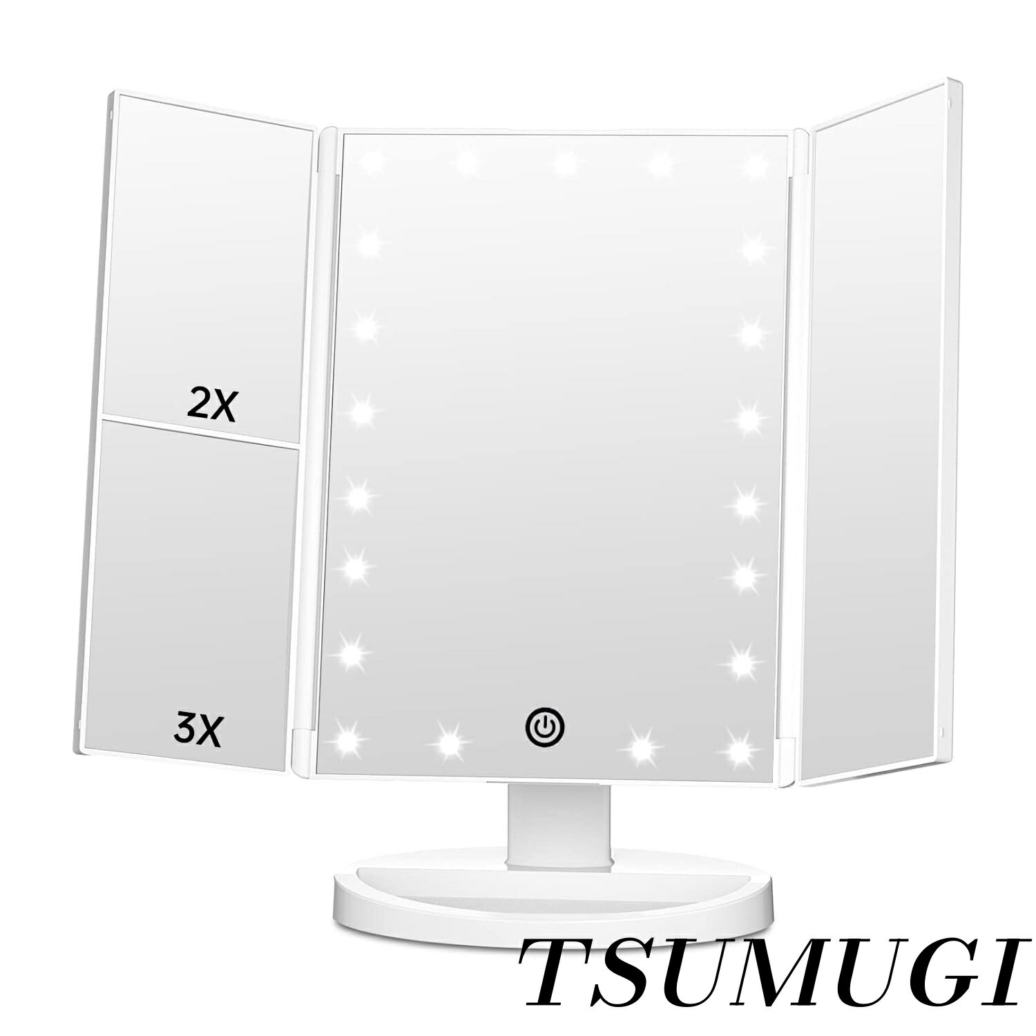 【折り畳み式・人気の三面鏡】折りたたみ式の卓上スタンドミラーは、3種類の鏡が備わっており左右の鏡はスムーズに角度調整が可能です。鏡全体を前後180度まで調節可能ですので様々な角度から見ることができて大変便利です。設置する場所やテーブルに合わせたスムーズな角度調整が可能なのでお客様の環境に合わせた使い方ができます。またコンパクトに収納でき三面鏡は閉じることができるのでいつも清潔に保つことができます。【明るさ抜群のLEDライト付き】化粧ミラーの周りに21個のLEDライトを搭載しており、お顔を明るく照らすことが可能です。顔全体を明るく照らすことでシミやくすみなどといった肌のアラを目立たせず、自然なツヤやなめらかさといった自然な仕上がりへと導いてくれます。照明のスイッチはタッチパネルになっており、無段階で明るさを調節できます。【2倍&3倍の拡大鏡付き】立体三面ミラーですのでお顔の正面だけでなく、横顔や顔全体をしっかり確認することができます。2倍&3倍の拡大鏡により、明るく細かい毛穴の状態を隅々までチェックでき、全体のバランスを確認しながら細やかな化粧をサポートしてくれます。【化粧鏡の台座には嬉しい小物入れ付き】女優化粧ミラーの下部のくぼみには、メイクがはかどるように小物いれをご用意。口紅やイヤリング、ヘアピンといった、ちょっとした小物を収納することができます。卓上がスッキリし定番で使用するアイテムを直ぐに見つけることができるのでメイクもはかどります。【選べる2WAYタイプ USB or 電池】折りたたみ式女優ミラーは、外出先で電源が確保できない時は、単4電池4本(別売り)をセットすると場所に関係なく利用できます。USB電源がある環境では、USBケーブル(付属品)を使用し照明を利用できます。電源が確保できない環境でも自由にどこでも女優鏡を使用できるのでメイクがとても楽しくなります!USB給電を利用する場合は念のため電池を外しておくことを推奨します。【安心保証】本製品はお買い上げ日から1年間の品質保証が付いております。弊社の厳しい品質検査をクリアした製品を出荷しておりますが万が一、不具合が見付かりましたら、保証期間内は安心保証を受けることができますのでお気軽にご連絡くださいませ。【折り畳み式・人気の三面鏡】折りたたみ式の卓上スタンドミラーは、3種類の鏡が備わっており左右の鏡はスムーズに角度調整が可能です。鏡全体を前後180度まで調節可能ですので様々な角度から見ることができて大変便利です。設置する場所やテーブルに合わせたスムーズな角度調整が可能なのでお客様の環境に合わせた使い方ができます。またコンパクトに収納でき三面鏡は閉じることができるのでいつも清潔に保つことができます。 【明るさ抜群のLEDライト付き】化粧ミラーの周りに21個のLEDライトを搭載しており、お顔を明るく照らすことが可能です。顔全体を明るく照らすことでシミやくすみなどといった肌のアラを目立たせず、自然なツヤやなめらかさといった自然な仕上がりへと導いてくれます。照明のスイッチはタッチパネルになっており、無段階で明るさを調節できます。 【2倍&3倍の拡大鏡付き】立体三面ミラーですのでお顔の正面だけでなく、横顔や顔全体をしっかり確認することができます。2倍&3倍の拡大鏡により、明るく細かい毛穴の状態を隅々までチェックでき、全体のバランスを確認しながら細やかな化粧をサポートしてくれます。 【化粧鏡の台座には嬉しい小物入れ付き】女優化粧ミラーの下部のくぼみには、メイクがはかどるように小物いれをご用意。口紅やイヤリング、ヘアピンといった、ちょっとした小物を収納することができます。卓上がスッキリし定番で使用するアイテムを直ぐに見つけることができるのでメイクもはかどります。 【選べる2WAYタイプ USB or 電池】折りたたみ式女優ミラーは、外出先で電源が確保できない時は、単4電池4本(別売り)をセットすると場所に関係なく利用できます。USB電源がある環境では、USBケーブル(付属品)を使用し照明を利用できます。電源が確保できない環境でも自由にどこでも女優鏡を使用できるのでメイクがとても楽しくなります!USB給電を利用する場合は念のため電池を外しておくことを推奨します。 【安心保証】本製品はお買い上げ日から1年間の品質保証が付いております。弊社の厳しい品質検査をクリアした製品を出荷しておりますが万が一、不具合が見付かりましたら、保証期間内は安心保証を受けることができますのでお気軽にご連絡くださいませ。