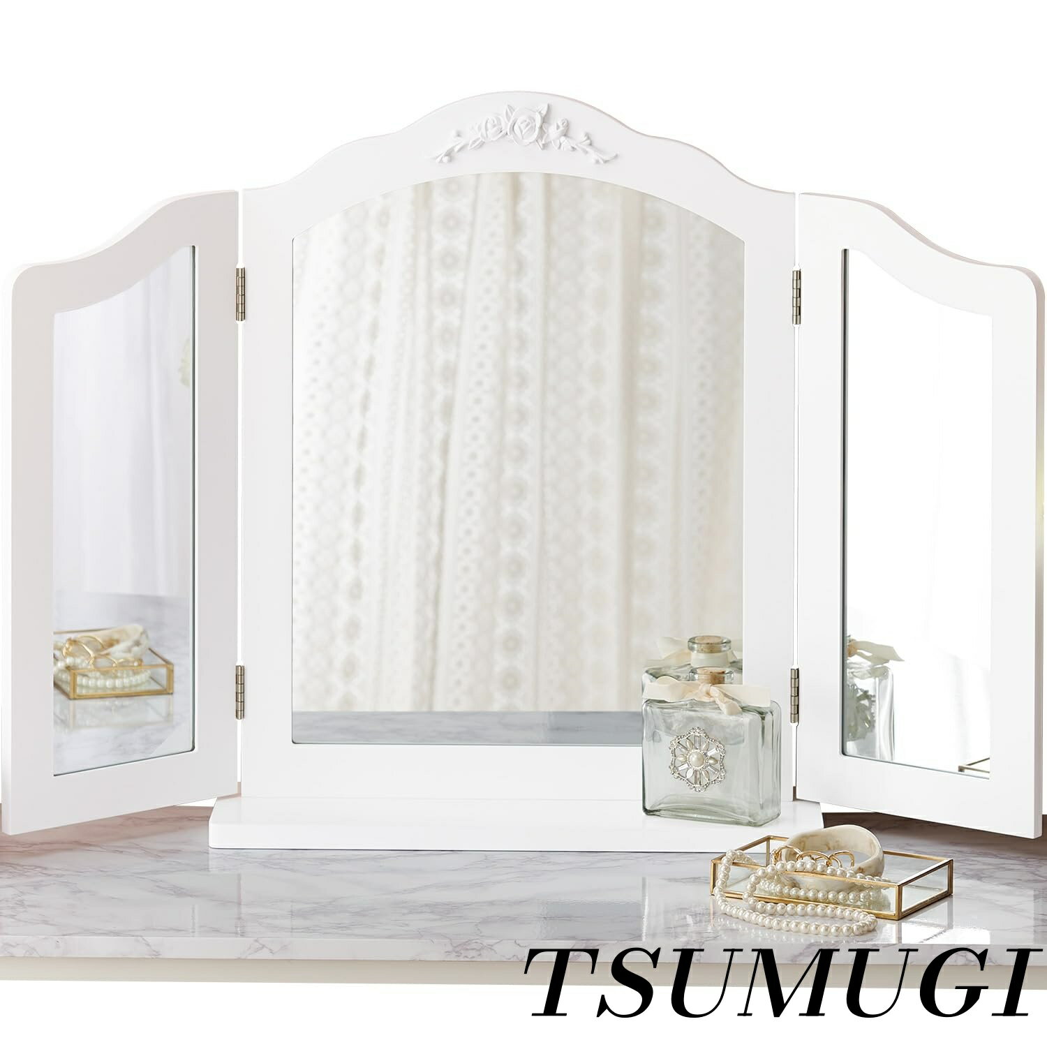 【本体サイズ】:(約)幅84×奥14.5×高さ56.5cm【憧れの女優ミラーを】上部の中央にあしらわれたローズレリーフのモチーフが特別感を醸し出す、ホワイトのシンプルなシルエットの中のさりげない曲線がエレガントな三面鏡ミラー【お部屋のデスクをドレッサーに】手持ちのデスクやローテーブルとの組み合わせれば憧れのドレッサーを作れます。【お化粧の強い味方】三面鏡はメイクやヘアセットの左右のバランスが同時にチェックできるのでワンランク上のスタイリングに!まるで憧れの女優さんになった気分にしてくれます。ドレッサーが欲しいけど、スペースにお悩みな方にオススメです。※商品は「組立式」となります。【本体サイズ】:(約)幅84×奥14.5×高さ56.5cm 【憧れの女優ミラーを】上部の中央にあしらわれたローズレリーフのモチーフが特別感を醸し出す、ホワイトのシンプルなシルエットの中のさりげない曲線がエレガントな三面鏡ミラー 【お部屋のデスクをドレッサーに】手持ちのデスクやローテーブルとの組み合わせれば憧れのドレッサーを作れます。 【お化粧の強い味方】三面鏡はメイクやヘアセットの左右のバランスが同時にチェックできるのでワンランク上のスタイリングに!まるで憧れの女優さんになった気分にしてくれます。ドレッサーが欲しいけど、スペースにお悩みな方にオススメです。 ※商品は「組立式」となります。