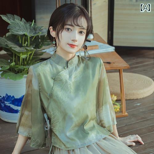 スカート セットアップ レディース 改良漢服風 ロング丈 2点セット チャイナ風 春夏 七分丈フリル袖 刺繍 ウエストリボン 上品 エレガント きれいめ 通勤 お出かけ ポリエステル素材