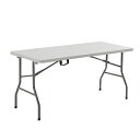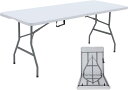 ・【製品仕様】使用時/152×70×高さ74、折畳み時/76×70cm、 天板厚み/4cm 。 素材:天板/HDPE(軽量 高密度ポリエチレン) 脚/スチール。 重量:10kg 仕様:折りたたみ時持ち運びハンドル付き。・【折り畳み式とロック】折り畳み式のデザイン、サイドロック、ハンドルにより、使用していないときでも持ち運びやクローゼットに簡単に保管できます。屋外でのアウトドアにも最適で、折りたためば車の後部座席やトランクにも収納できます。組み立ても不要で、テーブルを数秒で開いて折りたたむことができます。・【頑丈&耐久性】丈夫なプラスチック製の卓上には、掃除が簡単な表面があり、食べ物、飲み物、その他のさまざまなアイテムを保持できます。急な雨や飲み物を溢した時、サッと拭くだけでOK。・【安定したサポート】パウダーコーティングされたスチール製の脚と滑り止めのゴム製の足により、あらゆるイベント中にテーブルを所定の位置に維持できます。・【屋内・屋外】作業用、結婚式、お祭りのパーティー、家族の集まり、バーベキュー、ホームオフィスのワークステーションの設置など、屋内外のイベントに最適です。