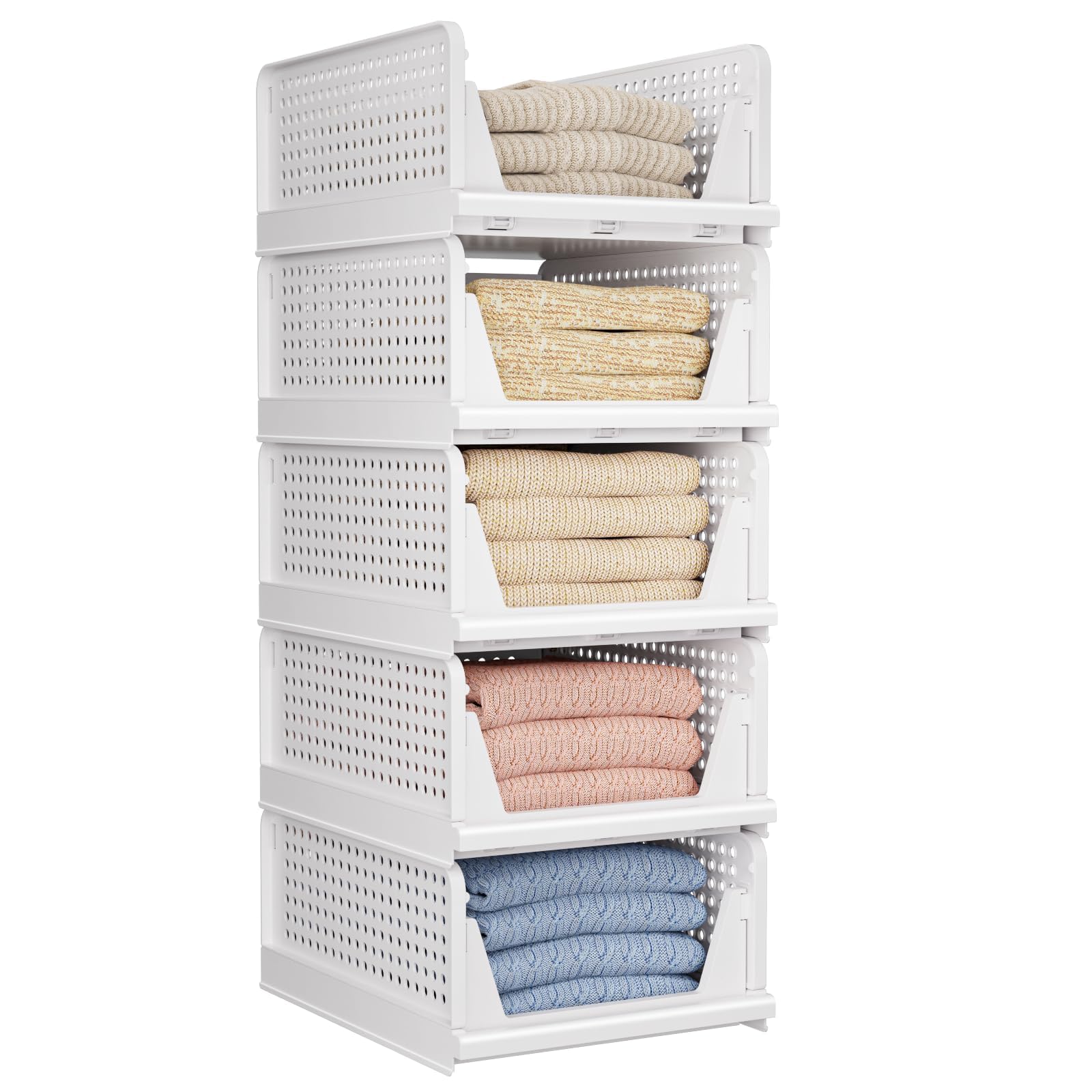 【まとめ買いで最大1000円OFFクーポン!】5段ボックス 奥行き43cm 収納ボックス 組み合わせて使える収納トレーワイド 押し入れ用 収納 プラスチックケース 折畳式 大容量 クローゼット収納 服 ぬいぐるみ 収納 積み重ね可能 省スペース 1セット5個 ホワイト