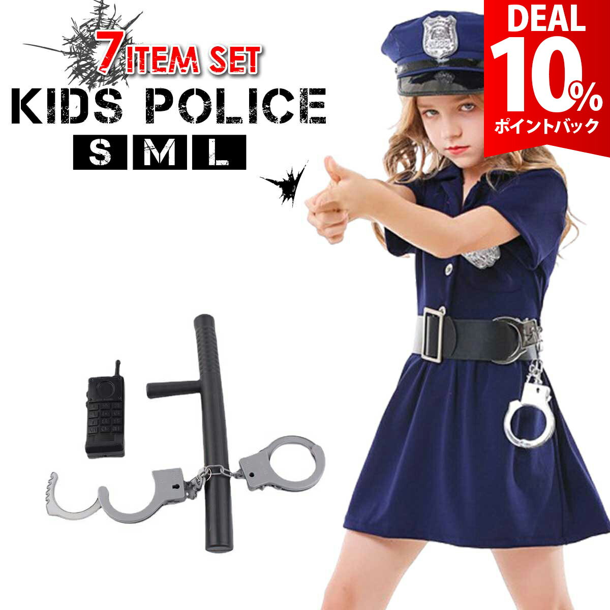 【本格7点セット】本格7点フルセット ポリス コスプレ 子供 警察官 ハロウィン コスチューム キッズ 警察 警官 制服 女の子 仮装 婦人警官 衣装 【 オシャレなデザイン 】細部までこだわった本格的な作りで、すぐに憧れのカッコイイポリスに変身することが出来ます。 【 本格的な作り 】海外の警察官をイメージし、デザイン、質感までこだわった本物そっくりのコスチュームです。リアルなポリスごっこが楽しめます。 【 豪華7点セット 】クールなポリスには欠かせない、手錠、警棒、トランシーバーなどセット内容も充実♪小物の品質も高いので、よりリアリティーな警察官を演出できます。 【 選べるサイズ展開 】サイズが豊富なので、お子様の身長にピッタリ合ったジャストサイズを選べます。 【 様々なシーンで大活躍 】ハロウィンやお誕生パーティーにピッタリ!なりきりごっこが大好きな女の子へのプレゼントにもおすすめです。 ご購入から30日間はメーカー保証付きです。 メーカー希望小売価格はメーカーサイトに基づいて掲載していますe0176 【 オシャレなデザイン 】細部までこだわった本格的な作りで、すぐに憧れのカッコイイポリスに変身することが出来ます。 【 本格的な作り 】海外の警察官をイメージし、デザイン、質感までこだわった本物そっくりのコスチュームです。リアルなポリスごっこが楽しめます。 【 豪華7点セット 】クールなポリスには欠かせない、手錠、警棒、トランシーバーなどセット内容も充実♪小物の品質も高いので、よりリアリティーな警察官を演出できます。 【 選べるサイズ展開 】サイズが豊富なので、お子様の身長にピッタリ合ったジャストサイズを選べます。 【 様々なシーンで大活躍 】ハロウィンやお誕生パーティーにピッタリ!なりきりごっこが大好きな女の子へのプレゼントにもおすすめです。 ■セット内容■ 7点セット(ワンピース、帽子、ベルト、バッジ、手錠、トランシーバー、警棒) ■サイズ(約)■ S:着丈60cm 胸囲66cm ウエスト62cm 適応身長120cm程度 M:着丈65cm 胸囲70cm ウエスト66cm 適応身長130cm程度 L:着丈70cm 胸囲78cm ウエスト68cm 適応身長140cm程度 ※手作業平置き測定の為多少の多少の誤差は許容範囲とさせていただきます。 ※ベルトループがきつめに縫製されています。ご了承ください。 ■素材■ ポリエステル ■着用感■ 6歳女の子(身長115cm 体重20kg 普段着のサイズ:120) Sサイズ着用:膝上10cm程度。イメージ写真に近い着こなしになります。 Mサイズ着用:膝丈でちょうどよい長さです。短いのはちょっと・・・という場合はこちらがオススメ ※商品写真はできる限り実物の色に近づけるよう調整しておりますが、お客様のお使いのモニター設定、お部屋の照明等により実際の商品と色味が異なる場合がございます。 恐れ入りますが色味が理由によるご返品はお受けしておりませんので、予めご了承ください。 ご注文前にご確認下さい ●よくあるご質問●
