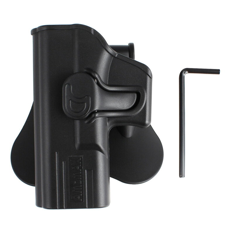 1,000円以下の商品を見る 2,000円以下の商品を見る 3,000円以下の商品を見る 4,000円以下の商品を見る 5,000円以下の商品を見る 6,000円以下の商品を見る商品詳細 【タクティカルホルスター】 Amomaxのホルスターは、特に安全性とファストシューティング両面を考慮して設計されています。 人間工学に基づいてデザインされたそのホルスターは、収納時には安定して銃をロックする一方で、 取り出す際には僅かにリリースボタンを押し込むだけで自然かつ素早くドローすることが可能です。 様々な携帯用アタッチメントも取り揃え、射撃訓練/競技、日常的なキャリングにも使用できます。 対応機種:Glock 19/23/32;ISSC M22シリーズ;ICS BLE-XAEシリーズ 【多様なキャリングプラットフォーム】 Amomaxのホルスターは、パドル(スタンダード)、ベルトクリップ、 MOLLE、ドロップレッグプラットフォームの、4つのキャリングプラットフォームに対応します。 パドルとベルトクリップはウェストバンド上にホルスターを携帯するタイプとなっています。 一般的な射撃訓練に使用することができるほか、3-Gun/4-Gun/5-Gunシューティングなどといった競技においても活躍します。 サバイバルゲームのようなエアソフトイベントに参加する際には、プレイヤーがタクティカルベストで携帯する場合はMOLLEアタッチメント、 太腿で携帯する場合にはドロップレッグプラットフォームが必要となります。 【360度回転】 ホルスター本体とキャリングプラットフォームは、歯車状のインターフェイスとスクリューによって固定されます。 このシステムにより、ホルスター本体は360度回転させることが可能となり、 簡単にキャリングポジションを調節することができるようになります。 キャリングポジション調節手順 1)後部のネジを緩める 2)ホルスター本体のキャリングポジションを調節する 3)ネジを締めて完了 【注意事項】 本製品は海外成型製品の為、成型の甘い部分やバリがある場合があります。 本製品は輸入品の為、パッケージに多少の傷や汚れがある場合があります。