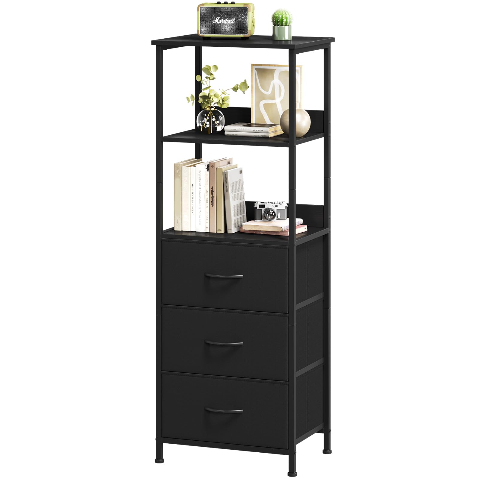 Somdot 縦型本棚 引き出し3個付き 本棚 棚付き 木製収納オーガナイザー キャビネット メタルフレームディスプレイ スタンディングシェルフユニット 寝室 キッチン オフィス用 ブラック