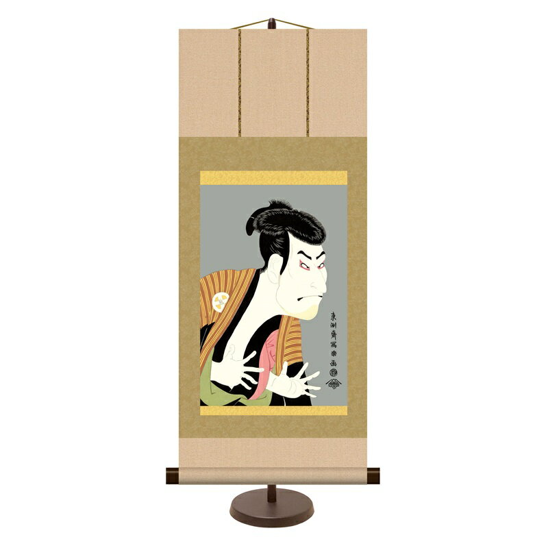 軸サイズ:幅31×高さ75cm■高精細技巧画(手彩補色)浮世絵/役者絵 ミニ掛軸 江戸の粋専用スタンド付き化粧箱収納東洲斎写楽 画奴江戸兵衛躍動感あふれる表情が生き生きと伝わってくる浮世絵役者絵本紙:新絹本軸先:合成樹脂浮世絵躍動感あふれる江戸の大衆文化が生み出した浮世絵は日本が世界に誇る芸術作品で、その価値は高い評価を受けています。中でも北斎、歌麿、写楽、広重などは特に異色を放っています。生き生きとした役者絵の表情と艶やかな美人画、いまにも動き出しそうな風景。絵師の表現力と卓越した江戸の職人の技がいかんなく発揮されています。役者絵歌舞伎役者や舞台そのもの、書割、大道具。小道具、歌舞伎を楽しむ人々などを描いた浮世絵である役者絵。歌舞伎は遊里とともに浮世絵を生む母体となったことから、ほとんどの絵師が役者絵を残している。高精細デジタル版画技法を用いております。現代美術館の有名美術品の複製にも採用され最も本物に近いと高い評価を頂いております。高精細な最新鋭機器により原画に限りなく近く表現されております。また、永年に渡る複製経験を経た工房の制作責任者が原画から克明に色取りをし、最終仕上げは熟練の修復専門画家により一部手彩の補色が加えられ完成致します。■ご購入についてのお願い■ご注文商品は受注製作に付き、お客様へ発送日及びお客様お荷物番号(宅配便伝票番号)を記載した「発送案内メール」送信した時点で決済、配送完了の処理を実行させていただきます。受注製作に付き悪しからずご了承の程、お願い申しあげます。<ご留意>★ご注文購入履歴の発送日は発送案内送信日になっていますがお届け日は発送案内メール記載の月日になります。★商品不良等のご対応につきましてはお届け日より起算されます。★決済日は配送案内メール日になります。高雅な芸術の香り漂う本物をお届致します。現代画壇をリードする名作揃え反り歪みがなくきれいに掛かる理想品質最高級ながら手ごろな低価格業界初の表装品質十年間保証付き全品純国産ご注意ください※手作業による仕上げの為、掲載画像と多少色が異なる場合があります。※表装柄が掲載画像と異なる場合がございます。※掛軸・額絵は全て受注制作のオーダーメイドです。※制作に、祝日・土日曜日を除く7〜10日程度かかります。制作に1週間から1か月ほどお時間をいただきます。10日以上かかる場合はご連絡を申し上げ、ご了承の場合は制作をさせていただきます。受注制作商品のため、受注後のお取消しは不可でございます。悪しからずご了承いただきますようお願い申し上げます。サイズは手作業のため若干の誤差がございます。色合いについては、写真撮影の状況やモニター等で実際の色合いと違って映る場合がございます。また、ハレーション効果等で実際の色目と違って見える場合もございますので、ご注意ください。商品は全て受注製作になりますので返品は不可となっております。受注時に配送予定確認メールを送信させていただき、注文取消し期日及び返品に付いてお知らせをいたします。お客様都合の返品は返品の運賃はお客様ご負担で、返品受け入れ期日をお知らせし、着荷後商品代金の50%をご返金の対象とさせていただきます。尚、お客様のメールが受信できない状況の場合も弊社発送予定メールが送信された扱いになりますのでメール受信機能にご留意ください。