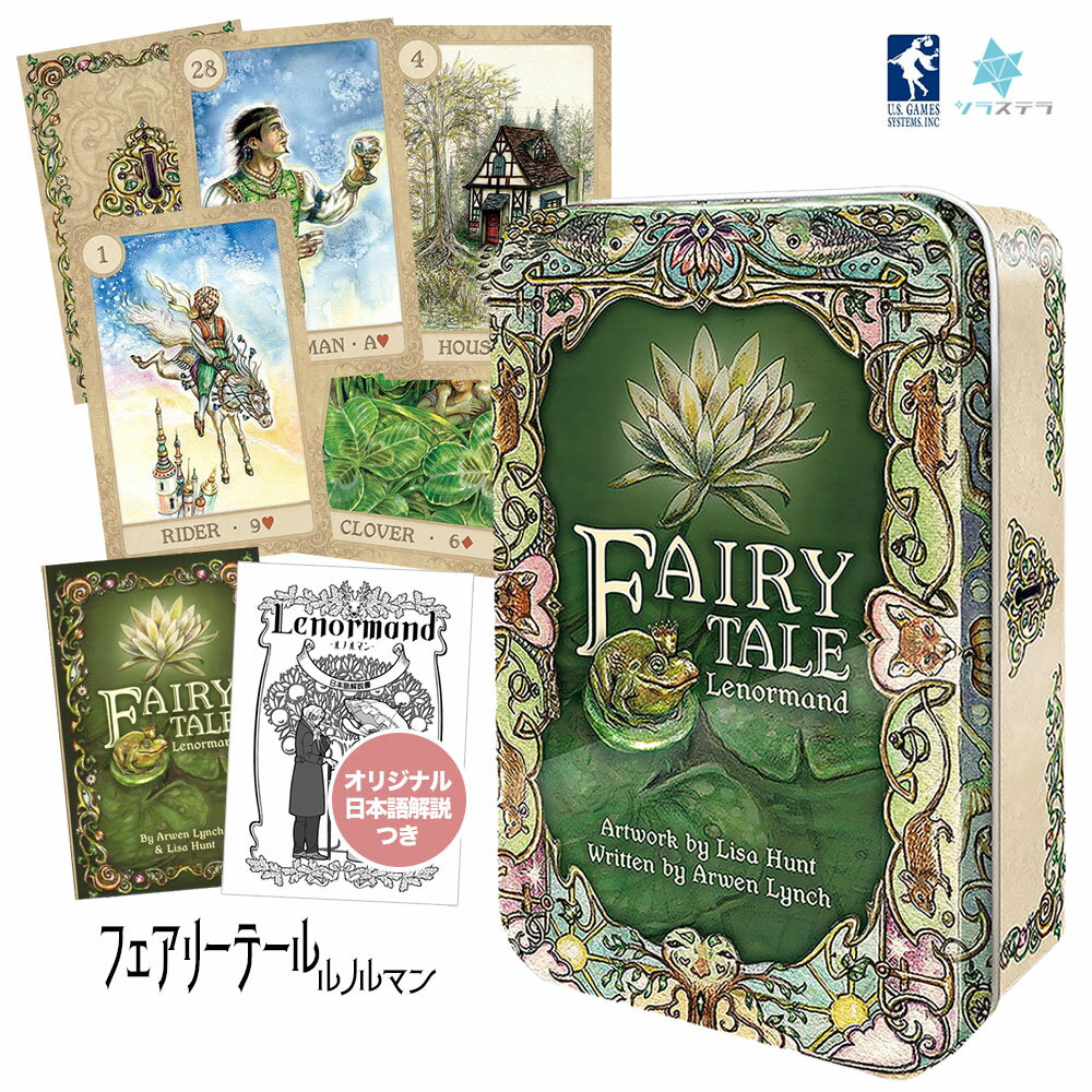 商品情報 ブランド U.S. Games Systems, Inc. ユーエスゲームスシステムズ 商品名 フェアリーテール ルノルマン Fairy Tale Lenormand 商品説明 ・小さく缶入りなこのデッキは持ち歩きに大変優れています。小さいカードはグランタブローも可能です。テーマに、おとぎ話の魔法やドラゴンを取り入れており、また衣類をまとって二足歩行する動物や、農民など、少し旧世界へ誘われる様子がうかがえます。2枚ずつ入っている紳士と淑女のカードは、こちらも若干の身分の違いなどで絵柄を変えてきています。同性パートナーや職場の仲間、友人など、幅広く同性占いができます。 ・ユニコーンに乗りたい、妖精と踊りたい、ドラゴンと戦いたい、王子様やお姫様と結ばれたいと夢見るすべての人に捧げます。 ・アーティストであるリサ・ハントが用意した神託は、あなたの人生に並行している絵本のイメージを、家族の幼少期のおとぎ話の鏡を通して教えてくれることでしょう。 ・伝統的なルノルマンのオラクルシステムに自信がない人、ルノルマンのような厳密な意味体系を学ぶことに興味がない人にとっても、これらの読者がよりタロットに近いフリーフローでカードを使えるよう、十分な詳細さと面白さが残されているのです。 ・本商品には当店オリジナルの日本語解説書が付属されます(商品専用の解説書ではありません)。初心者でも安心の、基礎知識、占い方、カードの意味などを記載しています。A7のポケットサイズなので、いつでもカードと共に持ち歩けます。白黒、全20ページ。 ・メーカーオリジナルブックレット(英語)つき。 こちらは輸入商品になります・海外からの輸送中のダメージ(細かなキズ、凹み)・メーカー側の予告無しの変更(デザイン、色)・品質(海外の印刷、作成技術)以上をご理解、ご了承頂けますようお願いいたします。※商品はシュリンク包装でピッタリと頑丈に梱包されています また、独特の匂いが生じる場合がございますが、開封してしばらく空気にさらすと落ち着きますので、気になる方はお試しください。 梱包サイズ 7 x 10.5 x 3.3cm; 142 g カードサイズ:57×89mm FTL38フェアリーテール ルノルマン Fairy Tale Lenormand 【正規品】 おとぎ話への入り口は、実は簡単に見つかります 9 カード選びに迷っている方必見です!