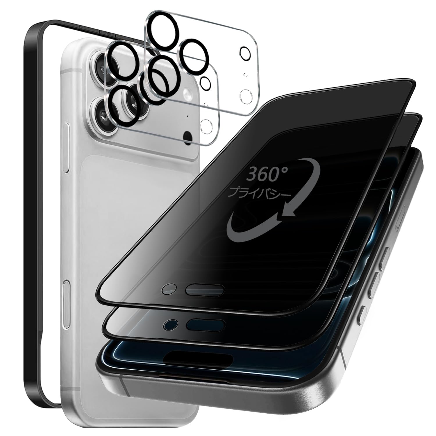 ・(1)【対応機種】iPhone 17promax(アイフォン17プロマックス) 6.9インチ用。同梱物:360°覗き見防止強化ガラスフィルム2枚、レンズ保護フィルム 2枚 、ガイド枠1個 、滑り止めマット*1、取扱説明書。商品は一枚一枚手作業で検査しましたので、品質は非常に安定しております、ご安心して弊社の製品をお買い求めください。・(2)【360°覗き見防止】ガラスフィルムは最新ののぞき見防止技術を採用しており、上下左右4方向の360度のぞき見防止。正面から見る時はっきり見える、高透過率があり。側方から見るときにはブラインドを通して画面が徐々に暗くなる。 いPhoneを視線角度から360度傾けても画面が見えないため、プライバシーを保護できる,電車や人が混雑する公共場所でいあいふぉん17promaxを楽しむことができる。・(3)【日本旭硝子製、全面保護】一般的なガラス保護フィルムよりも耐久性に優れたハードコーティング技術により、10Hの硬度を実現。特殊な飛散防止処理により、ガラスが割れても飛散せず、破片が付着したときに携帯電話の画面を傷から安全に保護できる。DZHFUのいphone液晶保護フィルム 一般的な製品に比べ3倍以上の保護力があり。・(4)【ほどよいサイズデザイン、指紋防止】縁はエッジの無い滑らか加工が施されています、iPhone17promax本体の縁まで適度なスペースを残すデザインとなっており、フィルムの剥がれや浮き上がりを防止し、スマホケースと干渉せずに快適に使えます。プラズマ疎油性コーティング処理、滑らかな手触り、指紋による汗や油分の残留を防ぎ。・(5)【初心者でも簡単に貼り付け可能】iPhoneを滑り止めマットの上に置きます、フィルムを貼る時にぶれないようにします。ほこりを取り除き、ガイド枠を利用することで、位置合わせてから貼り付ける必要 ガラスフィルムを画面に置くと自動的に吸着でき、指で真ん中から端に向かって軽く押すだけで。気泡もなく綺麗に仕上げることができます。(万が一失敗しても貼り直しが可能です。)2枚とも使えなくなってしまった場合は、またはガラスフィルム 発送中に故障や不良を発生した場合弊社に連絡してください。【連絡方法】「商品ページ」→「販売:DZHFU JP」→「質問する」弊社と連絡してください」。12時間以内にお客様の問題を解決します。お客様が満足できるまでアフターサービスを提供します。