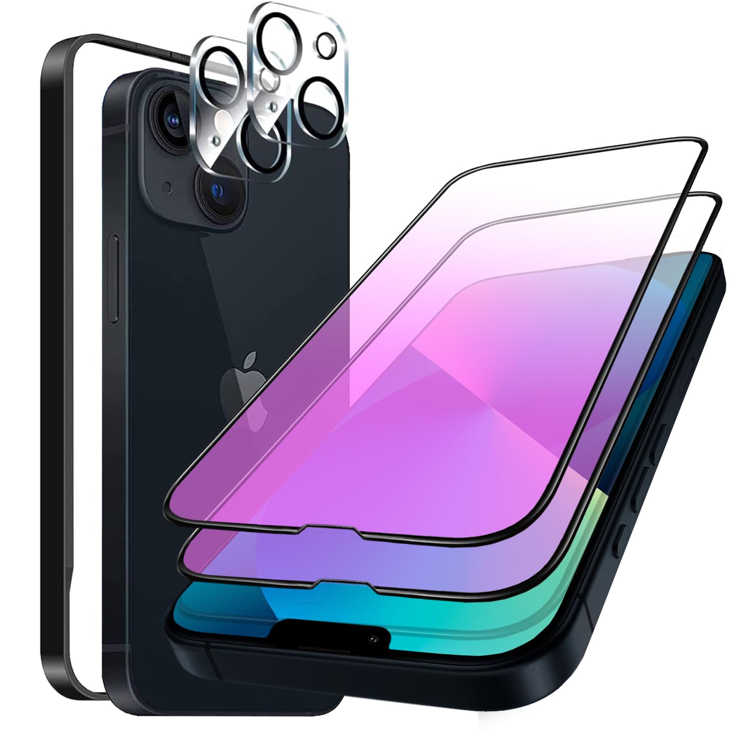 【4枚入り】ガラスフィルム iPhone 13 用 ブルーライトカット 全面保護 目の疲れを軽減 液晶保護フィルム 6.1インチ対応 気泡ゼロ 指紋防止 ガイド枠付き 貼り付け簡単 【アイフォン13 強化ガラスフィルム(2枚入り)+レンズ保護フィルム (2